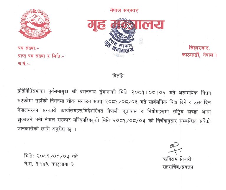 पूर्वसभामुख दमननाथ ढुंगानाको निधनमा सरकारले आज सार्वजनिक बिदा दिने निर्णय गरेको छ ।