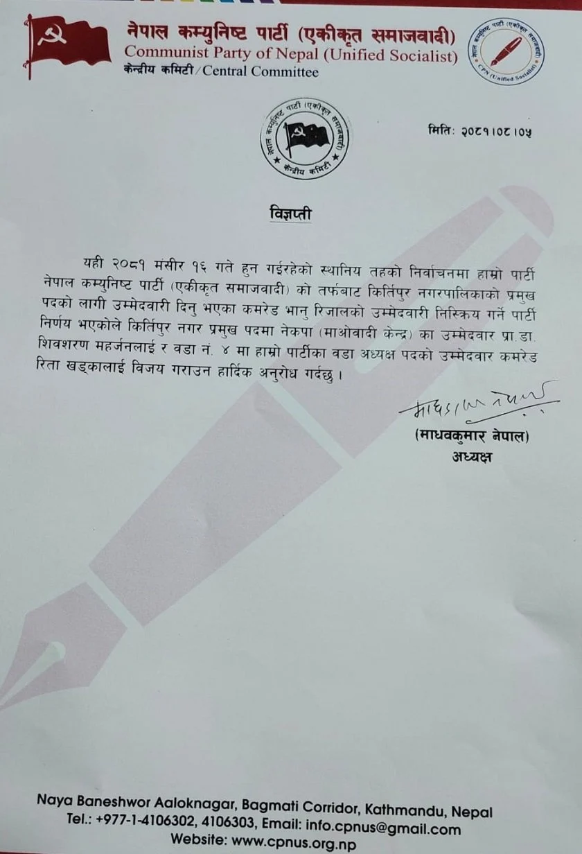 पार्टी अध्यक्ष माधवकुमार नेपालले बुधबार एक विज्ञप्ति जारी गर्दै आफ्नो पार्टीका उम्मेदवार रिजालको उम्मेदवारी निष्क्रिय भएकाले मेयर पदमा माओवादी केन्द्रका प्रा. डा. शिवशरण महर्जनलाई र कीर्तिपुर वडा नम्बर ४ मा रिता खड्कालाई विजय गराउन आह्नवान गरेका छन् ।