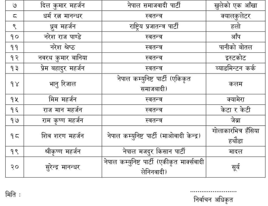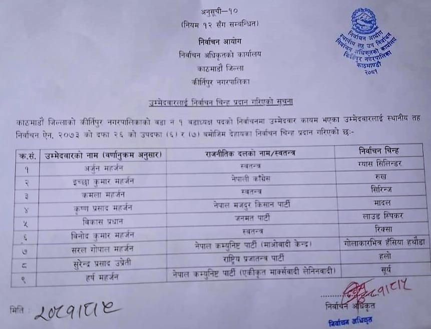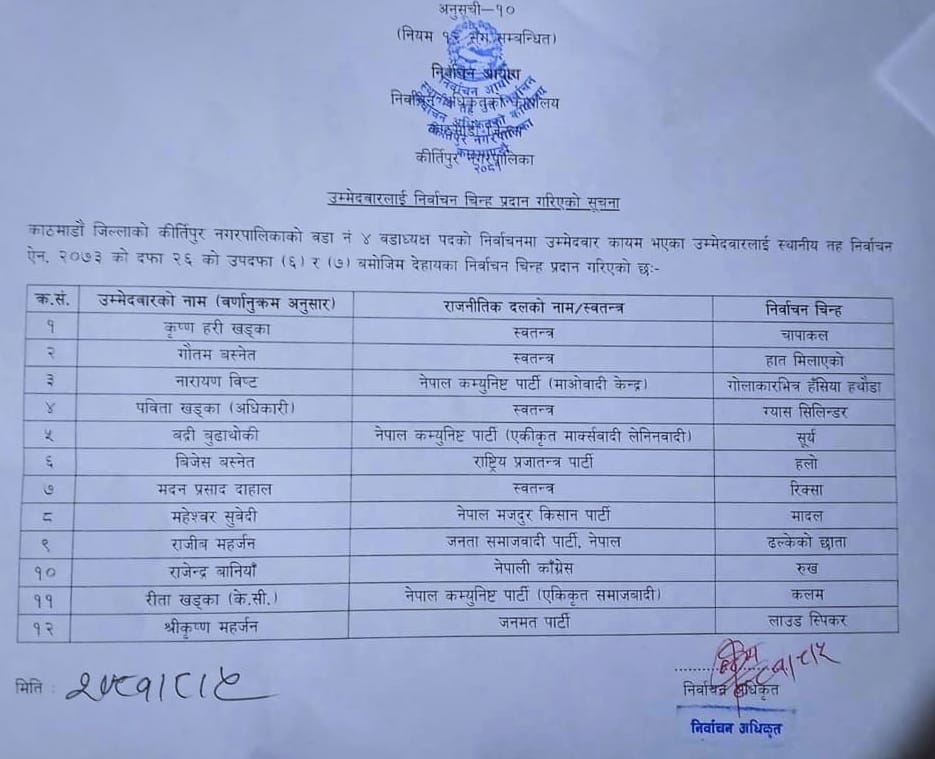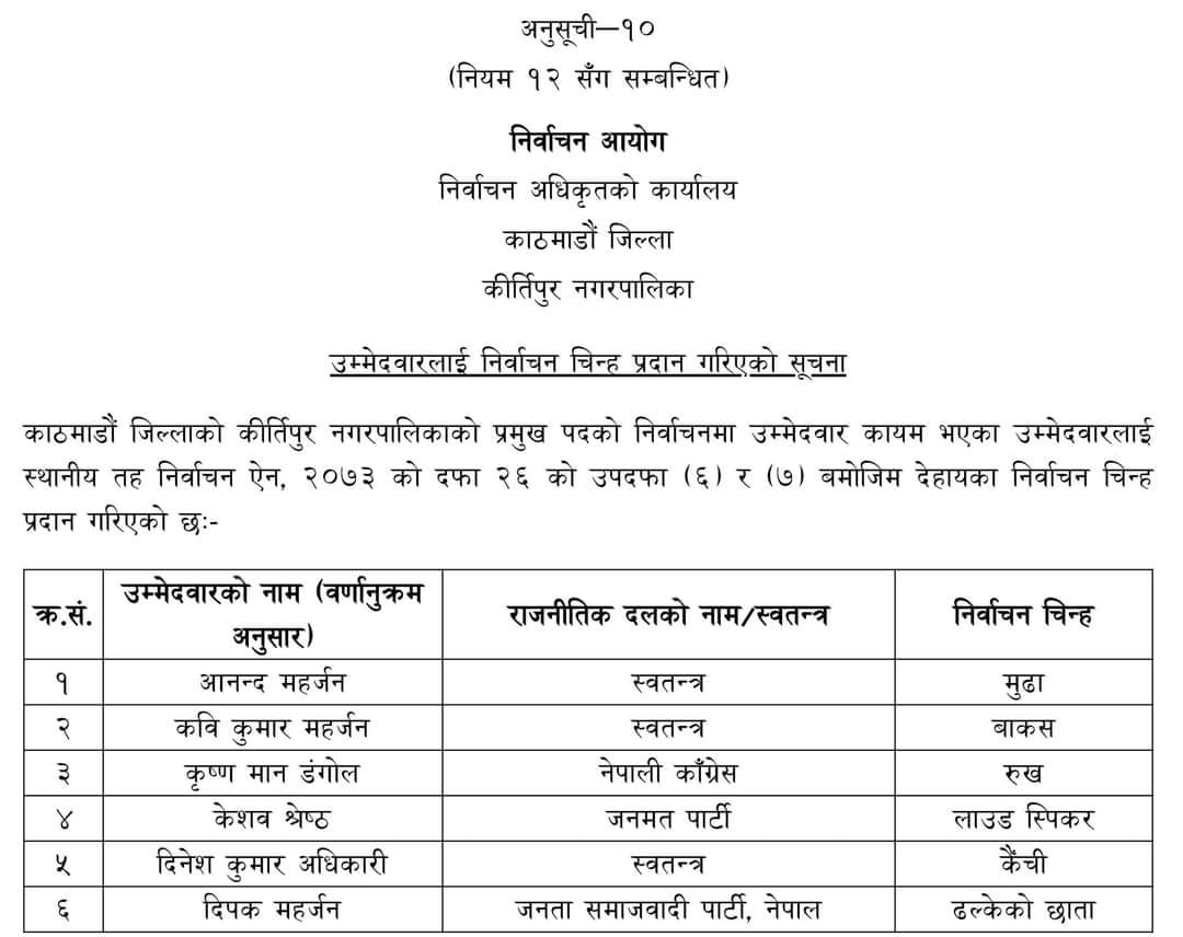 कीर्तिपुरमा कुन उम्मेदवारले के चुनाव चिन्ह पाएः