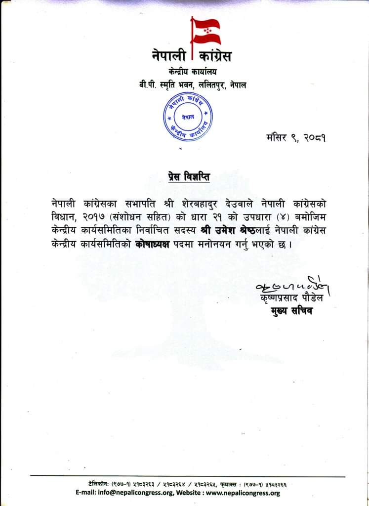 नेपाली काँग्रेसका कोषाध्यक्षमा उमेश श्रेष्ठ नियुक्त भएका छन् ।
