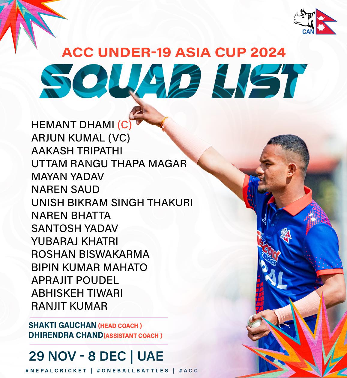 नेपाल क्रिकेट संघ (क्यान) ले एसीसी यू-१९ एसिया कप २०२४ का लागि नेपाली टोलीको घोषणा गरेको छ ।