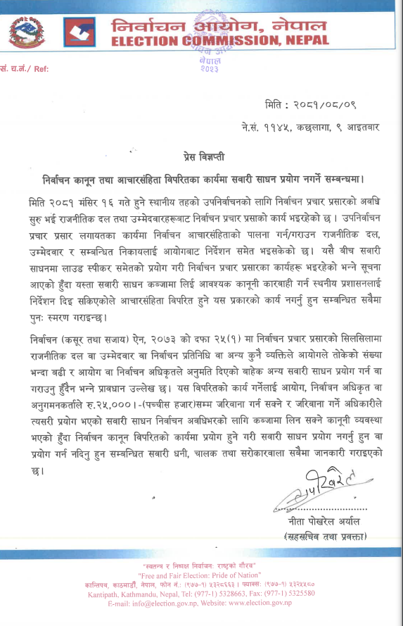 स्थानीय तहको उपनिर्वाचनका लागि निर्वाचन प्रचारप्रसारको अवधि सुरु भई राजनीतिक दल तथा उम्मेदवारबाट निर्वाचन प्रचारप्रसार भइरहेको उल्लेख गर्दै आचारसंहिता पालना गर्न-गराउन राजनीतिक दल, उम्मेदवार र सम्बन्धित निकायलाई निर्देशन दिइएको स्मरण गराएको छ ।