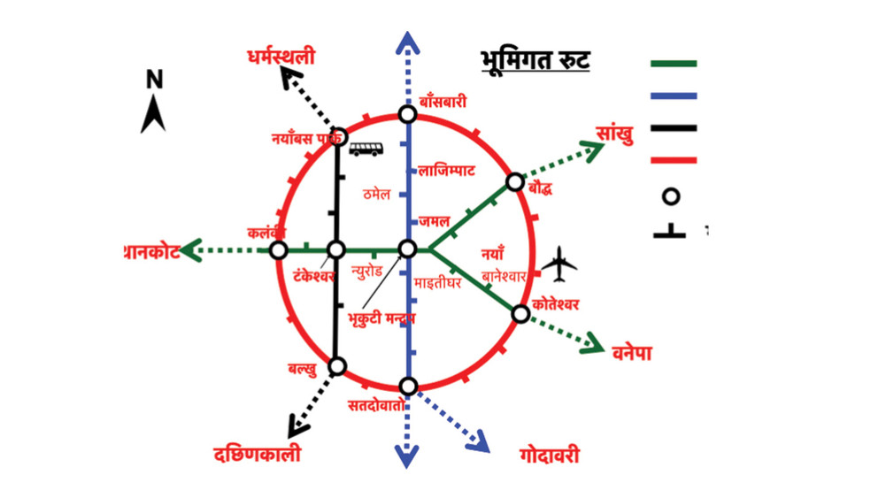 गुरुयोजनामा काठमाडौं उपत्यकामा पाँच लाइन– काठमाडौं लाइन (बनेपा, धुलिखेल, कोटेश्वर, भृकृटीमण्डप भएर थानकोट), पाटन लाइन (गोदावरीदेखि भृकुटीमण्डप, बुढानीलकण्ठ), विष्णुमती लाइन (दक्षिणकाली, चोभार, बल्खु, टंकेश्वर, नयाँ बसपार्क, धर्मस्थली), चक्रपथ लाइन (रिङरोड आसपास) र भ्याली लाइन (आउटर रिङरोड) प्रस्ताव गरिएको छ ।