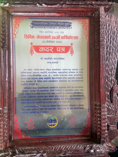 चन्द्रागिरि नगरपालिकालाई ‘सिविन-नेपाल राष्ट्रिय बालअधिकार’ सम्मान