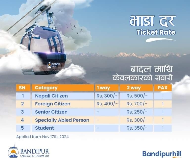 बन्दीपुर केबलकारको भाडादर के कति छ ?