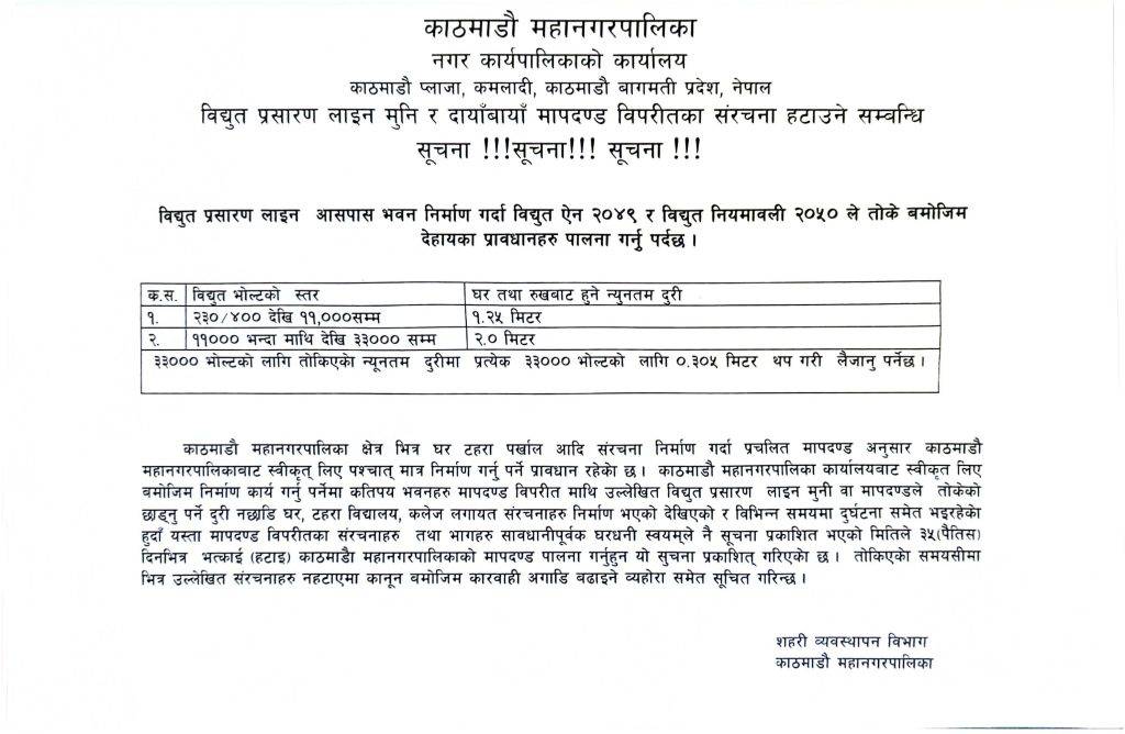 काठमाडौँ महानगरपालिकाले विद्युत प्रसारण लाइन मुनि र दायाँबायाँ मापदण्ड विपरlत बनेका संरचना हटाउन ३५ दिने सूचना निकालेको छ ।