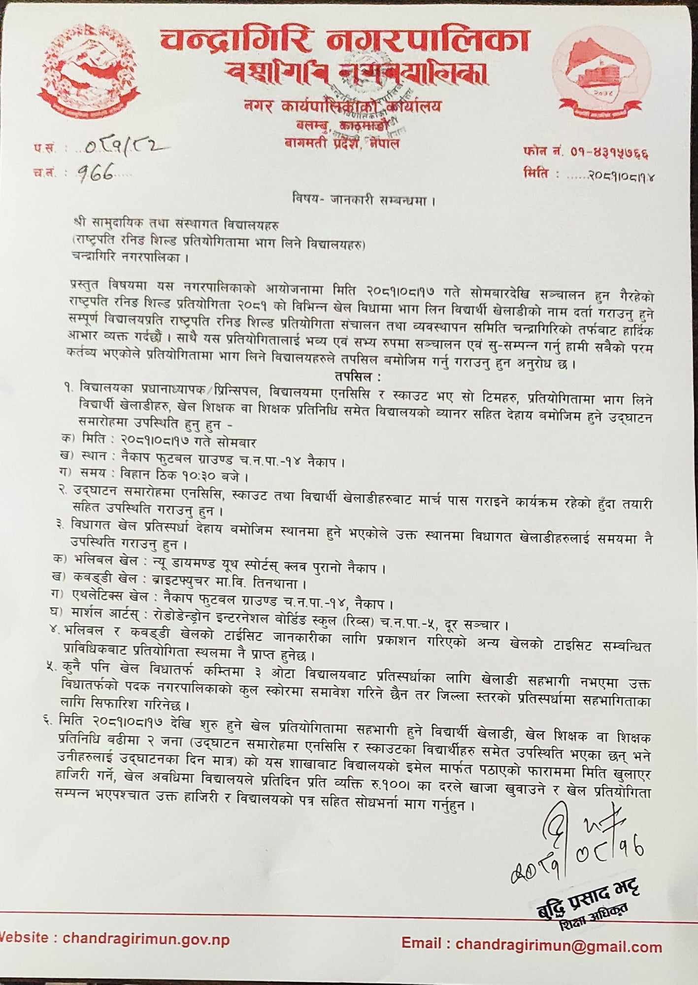 चन्द्रागिरि नगरपालिकामा आज मंसिर १७ गतेबाट पाँचाैं राष्ट्रपति रनिङ्ग शिल्ड प्रतियोगिता सुरु हुँदैछ ।