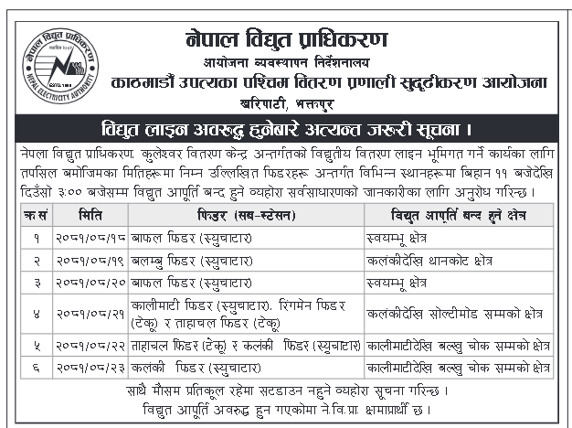 कलंकीदेखि थानकोटसम्म भोलि बुधबार बिहान ११ बजेबाट विद्युत सेवा अवरुद्ध हुने