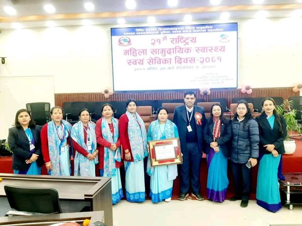 साे क्रममा सम्बन्धित स्वास्थ्य संस्थाबाट सिफारिस भएका १६ जना महिला सामुदायिक स्वास्थ्य स्वयंसेविकाहरूको सम्मान गरिएको थियाे ।