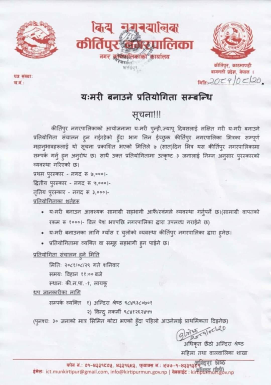 कीर्तिपुर नगरपालिकाको आयोजनामा मंसिर २९ गते कीर्तिपुर नगरपालिका १ लायकूमा प्रतियोगिता सञ्चालन हुने बताइएको छ ।