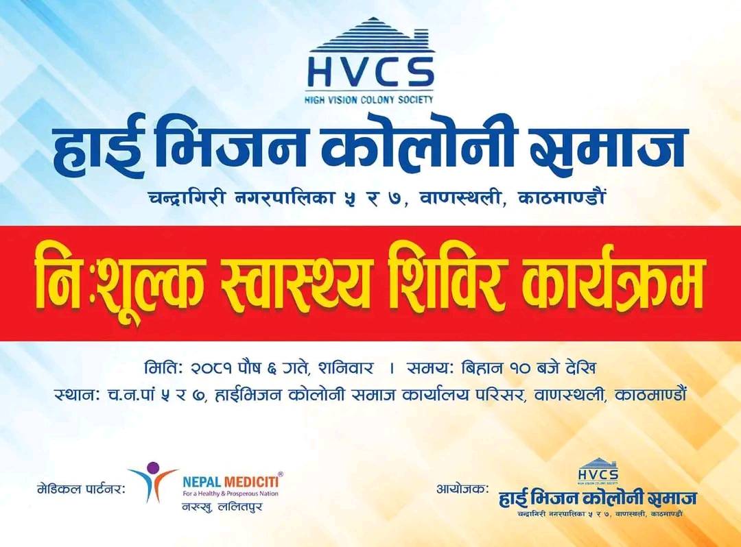 हाईभिजन कोलोनी समाजको आयोजनामा पाैष ६ गते शनिबार चन्द्रागिरि नगरपालिका ५ र ७ स्थित वाणस्थलीमा बृहत स्वास्थ्य शिविर सञ्चालन हुने भएको छ ।