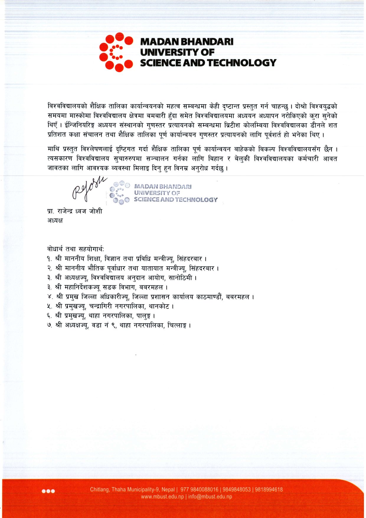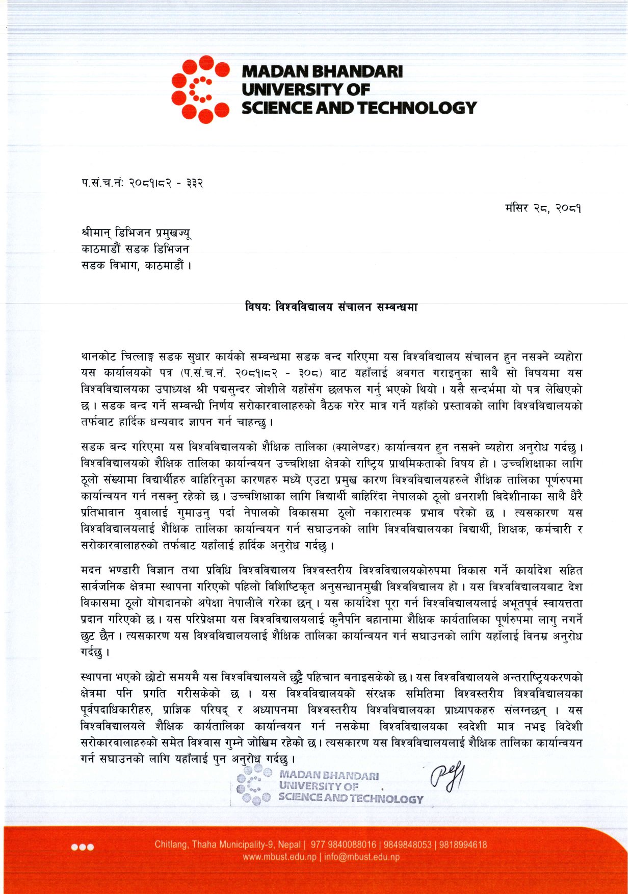 विश्वविद्यालयले सडक डिभिजनलाई लेखेको पत्र यस्तो छः