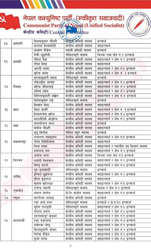 बैठकले सात वटै प्रदेशमा इन्चार्ज र सहइन्चार्ज पनि तोकेको छ ।