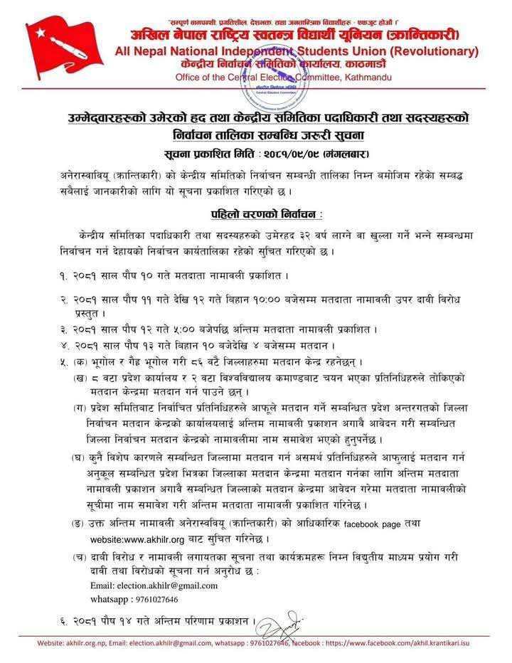 नेकपा (माओवादी केन्द्र) निकट विद्यार्थी संगठन अखिल (क्रान्तिकारी) को नेतृत्व चयन पुस १७ मा हुने भएको छ ।