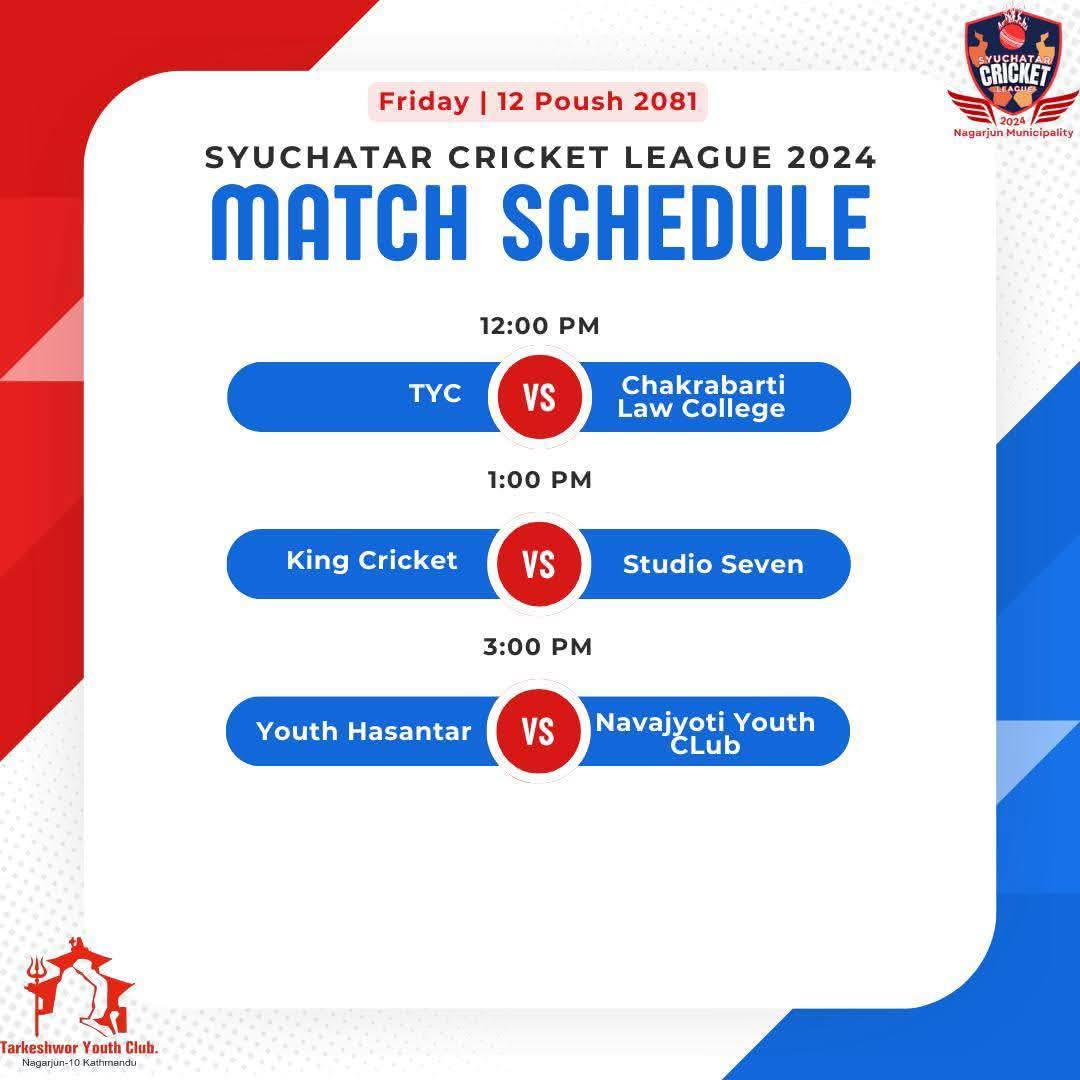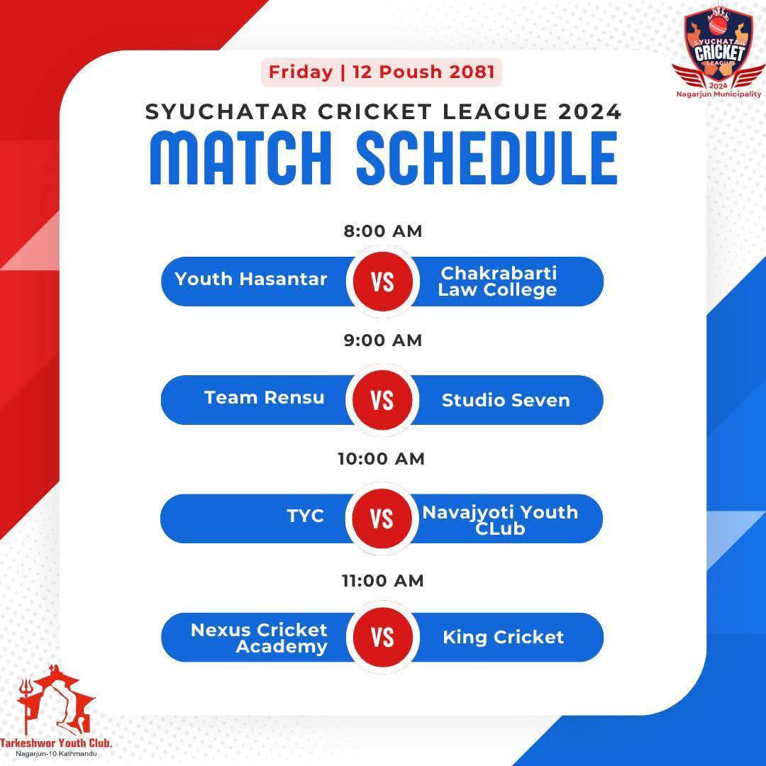 नागार्जुन नगरपालिकास्थित तार्केश्वर युवा क्लबको आयोजनामा आजबाट स्युचाटार क्रिकेट लिग प्रतियोगिता हुँदैछ ।