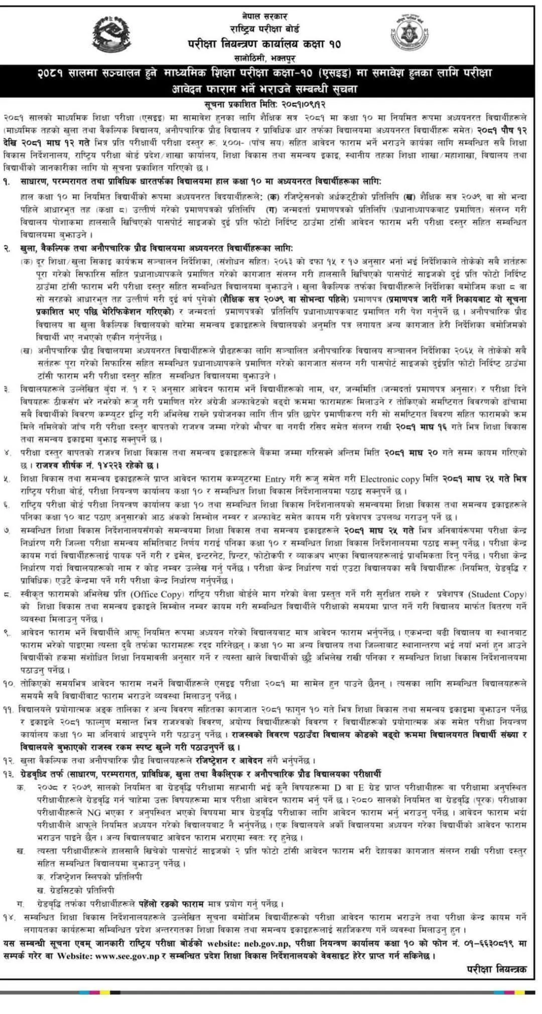 तोकिएको समयभित्र फाराम भर्ने व्यवस्था मिलाउन विद्यालयलाई निर्देशन दिँदै बोर्डले आवेदन फाराम नभर्ने विद्यार्थीले एसइई- २०८१ मा सामेल हुन नपाउने जनाएको छ । २०७८ र २०७९ सालको नियमित वा ग्रेडवृद्धि परीक्षामा सहभागी भई कुनै विषयमा ‘डी’ वा ‘ई’ ग्रेड प्राप्त परीक्षार्थी वा परीक्षामा अनुपस्थित परीक्षार्थीहरुले ग्रेडवृद्धि गर्न चाहेमा ती विषयमा मात्र परीक्षा आवेदन फाराम भर्नुपर्ने बोर्डले जनाएको  छ।