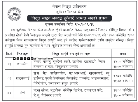 गोरखापत्र दैनिकमा एक सूचना जारी गर्दै प्राधिकरणको कुलेश्वर वितरण केन्द्रले थानकोट फिडर अन्तर्गतका विभिन्न क्षेत्रमा मध्यान्हबाट केही घण्टा बिजुली सेवा अवरुद्ध हुने जनाएको हो ।