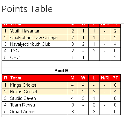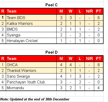 हालसम्म समुह ‘बी’ बाट किंंग्स क्रिकेट र स्टुडियो सेभेन, समुह ‘सी’ बाट टिम बिडीएस तथा समुह ‘डी’ ग्रेट हिमालय क्रिकेट एकेडेमीले क्वार्टरफाइनलमा स्थान सुरक्षित गरेका छन्।