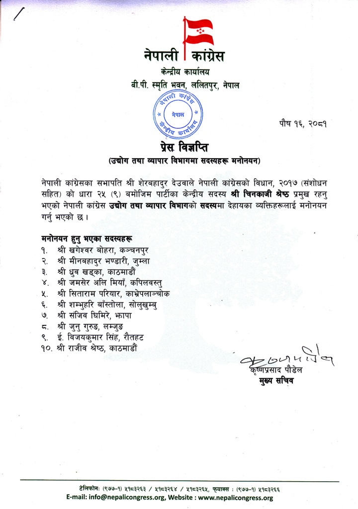 नेपाली कांग्रेसको उद्योग तथा व्यापार विभागको सदस्यमा थप सदस्य मनोनीत भएका छन् ।