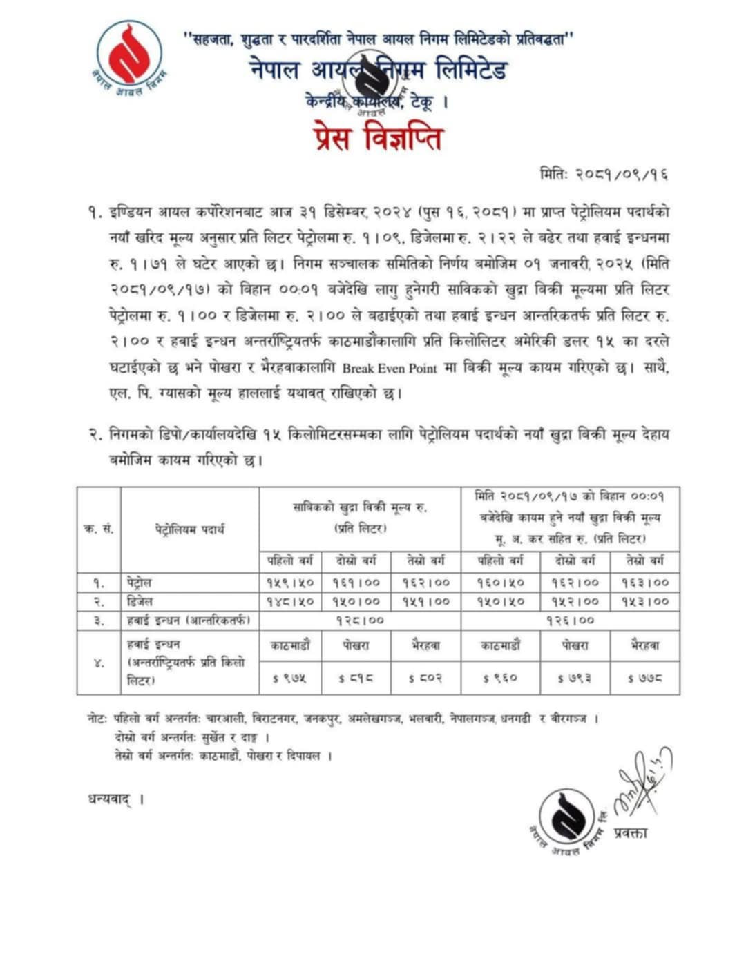 निगमले हवाई इन्धनको मूल्य भने घटाएको छ । हवाई इन्धन आन्तरिकतर्फ प्रतिलिटर दुई रुपैयाँ र अन्तर्राष्ट्रियतर्फ काठमाडौंका लागि प्रतिकिलोलिटर अमेरिकी डलर १५ का दरले घटाइएको छ ।