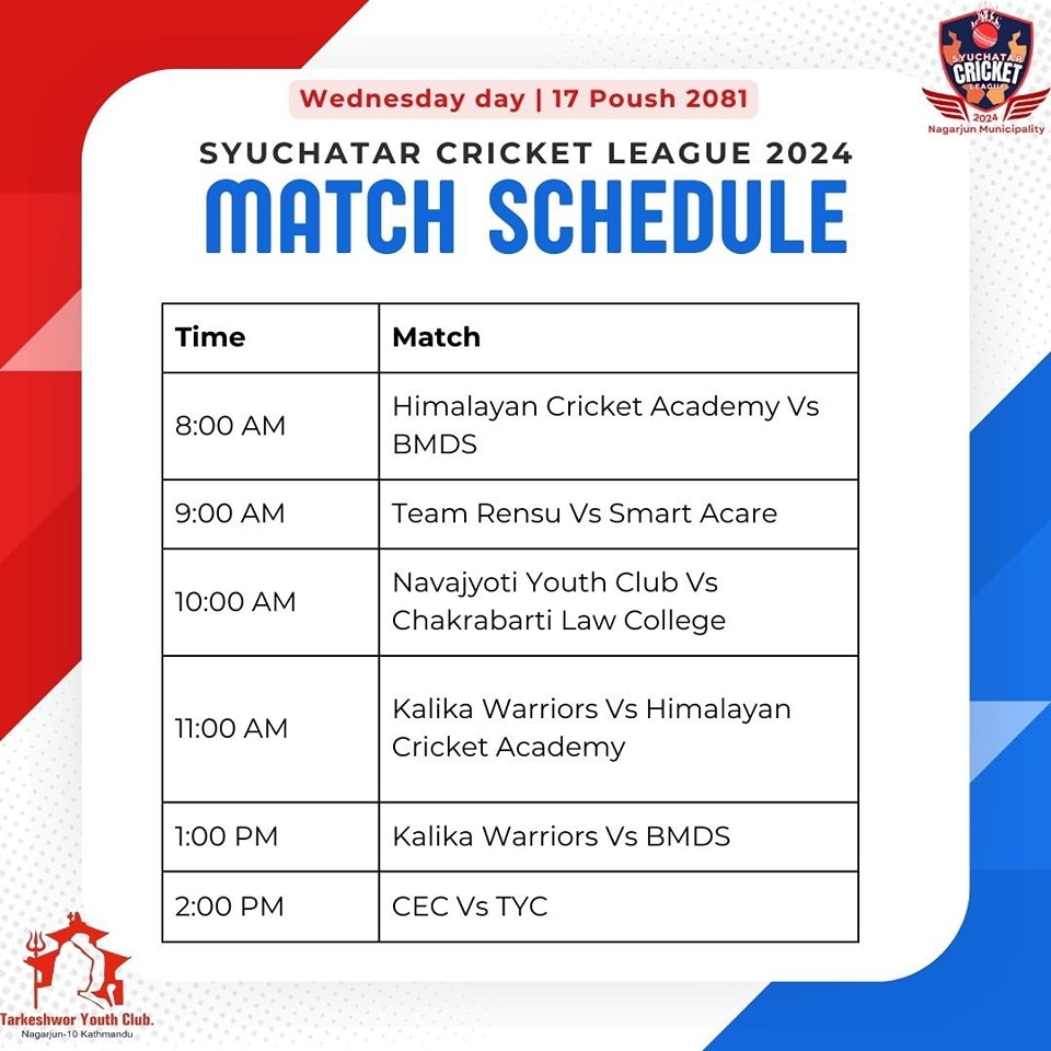नागार्जुन नगरपालिकास्थित तारकेश्वर युवा क्लबको आयोजनामा जारी स्युचाटार क्रिकेट लिग इन्डोर टी–१० प्रतियोगिताको क्वाटर फाइनल पुग्ने सबै ८ टोलीको टुंगो लागेको छ ।