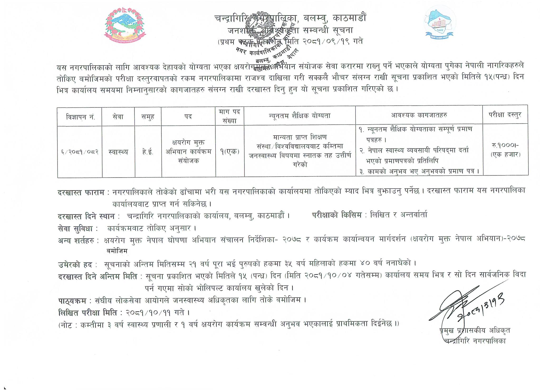 अभियान सञ्चालनका लागि चन्द्रागिरि नगरपालिकाले विशेषज्ञ कर्मचारी भर्ना गर्न आवेदन आह्वानसमेत गरेको छ ।