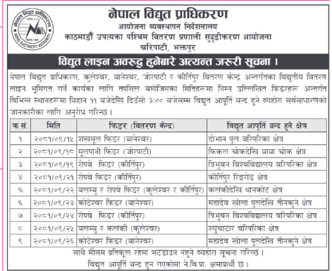 नेपाल विद्युत प्राधिकरणको काठमाडौं उपत्यका पश्चिम वितरण प्रणाली सुदृढीकरण आयोजनाले कुलेश्वर, कीर्तिपुर वितरण केन्द्रमा बिहान ११ बजेदेखि दिउँसो ३ बजेसम्म कलंकीदेखी थानकोटसम्मको क्षेत्रमा विद्युत आपूर्ति बन्द रहने जानकारी दिएको हो ।
