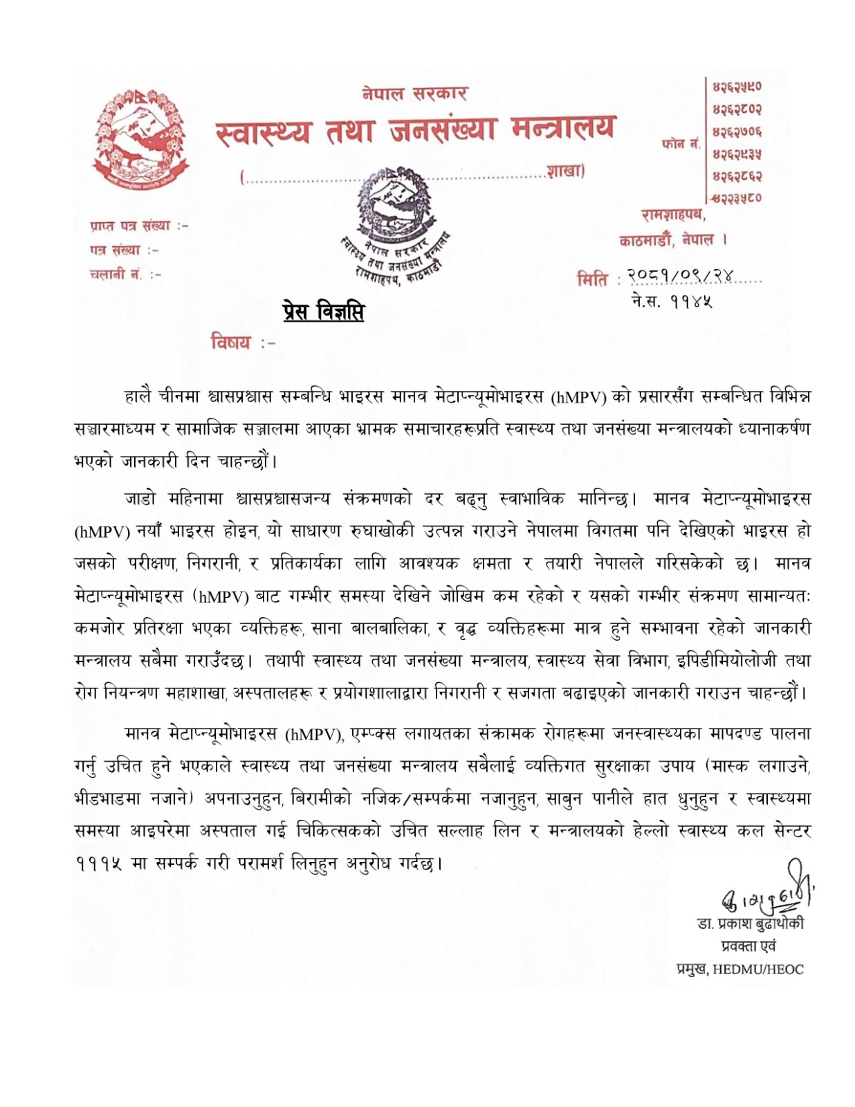 स्वास्थ्य तथा जनसङ्ख्या मन्त्रालयले चीनमा देखिएको भनिएको ‘मानव मेटाप्न्यूमो भाइरस’ (एचएमपीभी) साधारण भाइरस भएको जनाएको छ।