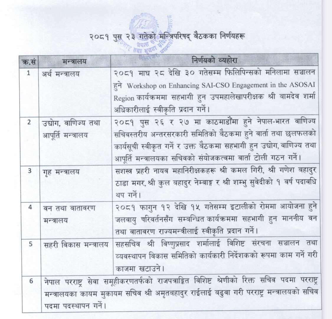 सरकारले सशस्त्र प्रहरी नायब महानिरीक्षकहरू कमल गिरी, गणेशबहादुर ठाडा मगर, कुलबहादुर नेम्वाङ र शम्भु सुवेदीको एक वर्ष पदावधि थप गर्ने तथा सहरी विकास मन्त्रालयका सहसचिव विष्णुप्रसाद शर्मालाई विशिष्ट संरचना सञ्चालन तथा व्यवस्थापन विकास समितिको कार्यकारी निर्देशकको रूपमा काजमा खटाउनेल गायतका निर्णय गरेको छ।