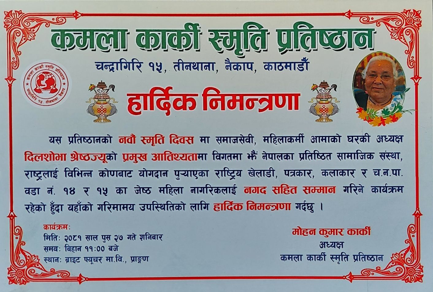 कमला कार्की स्मृति प्रतिष्ठानले नवाैं स्मृति दिवसका अवसरमा सम्मानित हुने व्यक्ति तथा संस्थाको निर्क्याैल गरिसकेको बताइएको छ ।