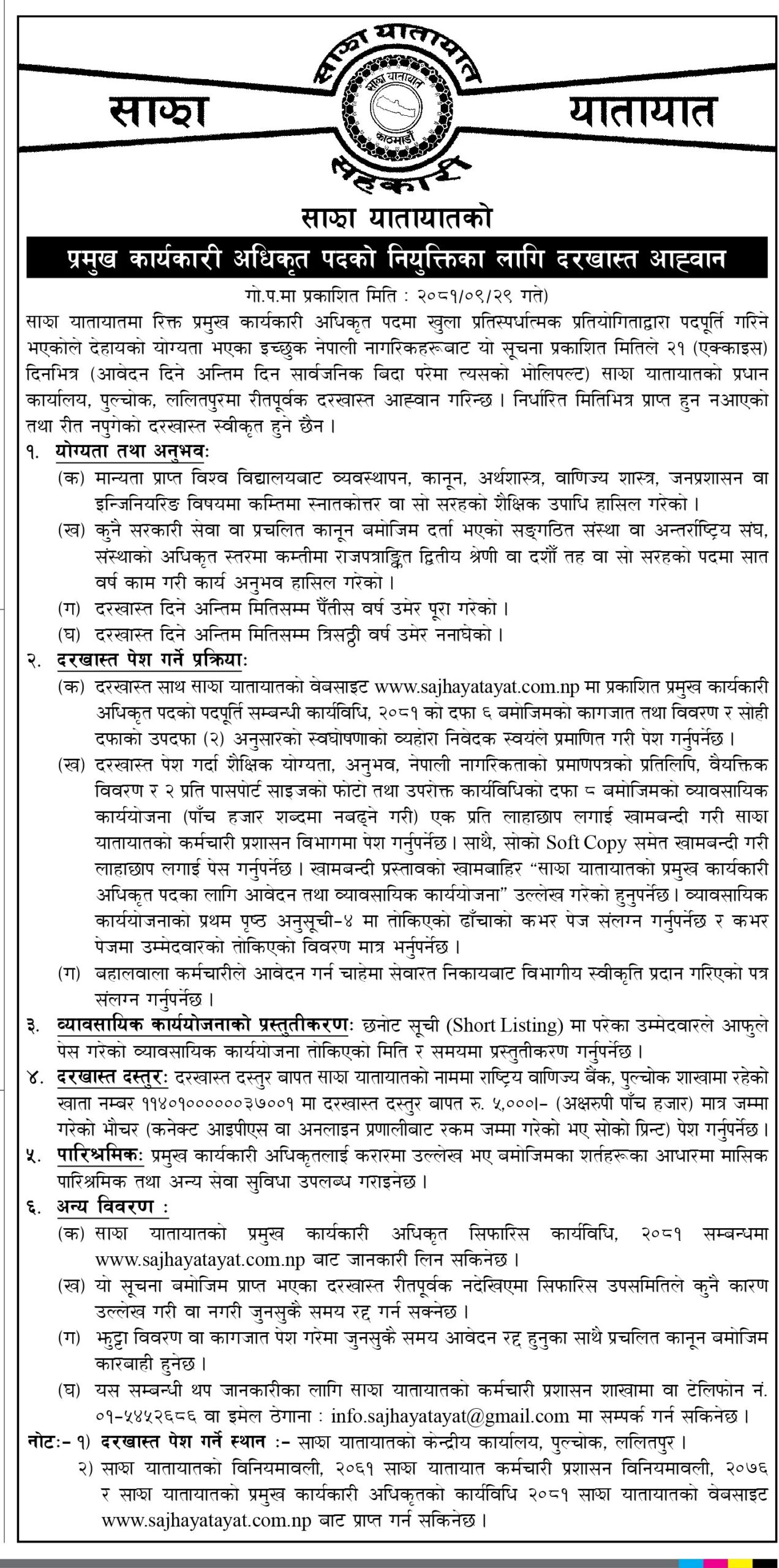 साझा यातायातले प्रमुख कार्यकारी अधिकृत पदको नियुक्तिका लागि दरखास्त आह्वान गरेको छ ।
