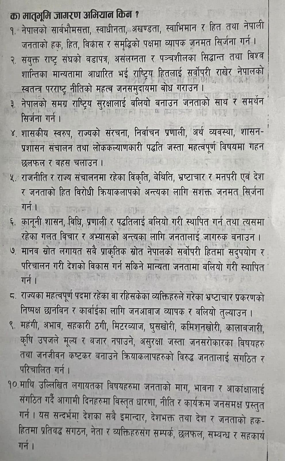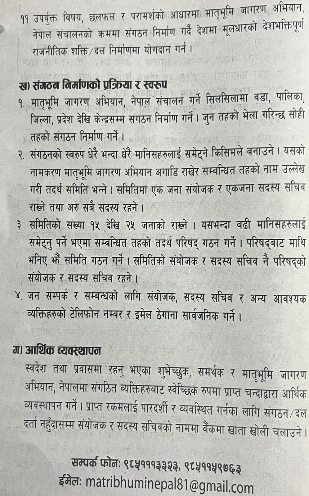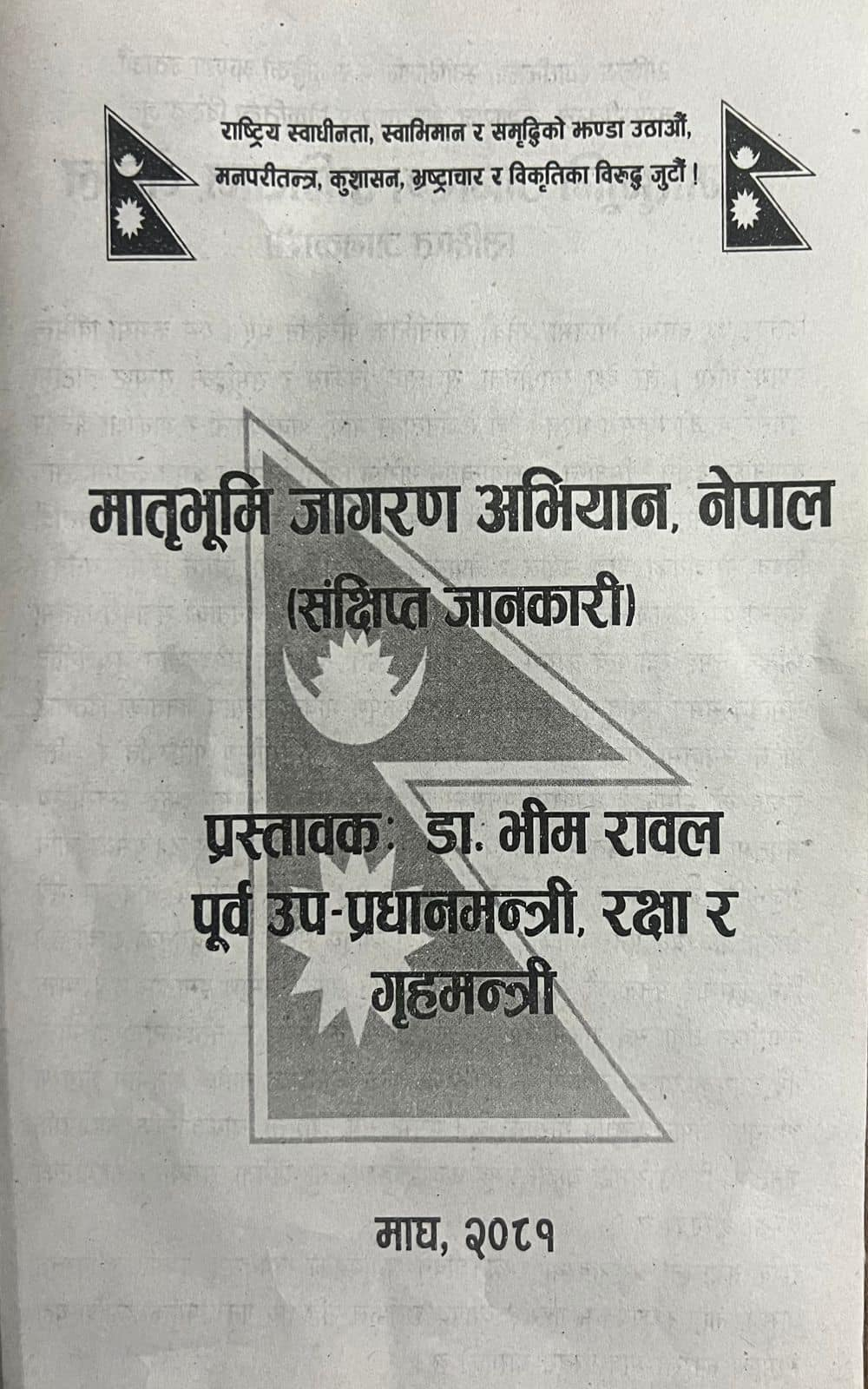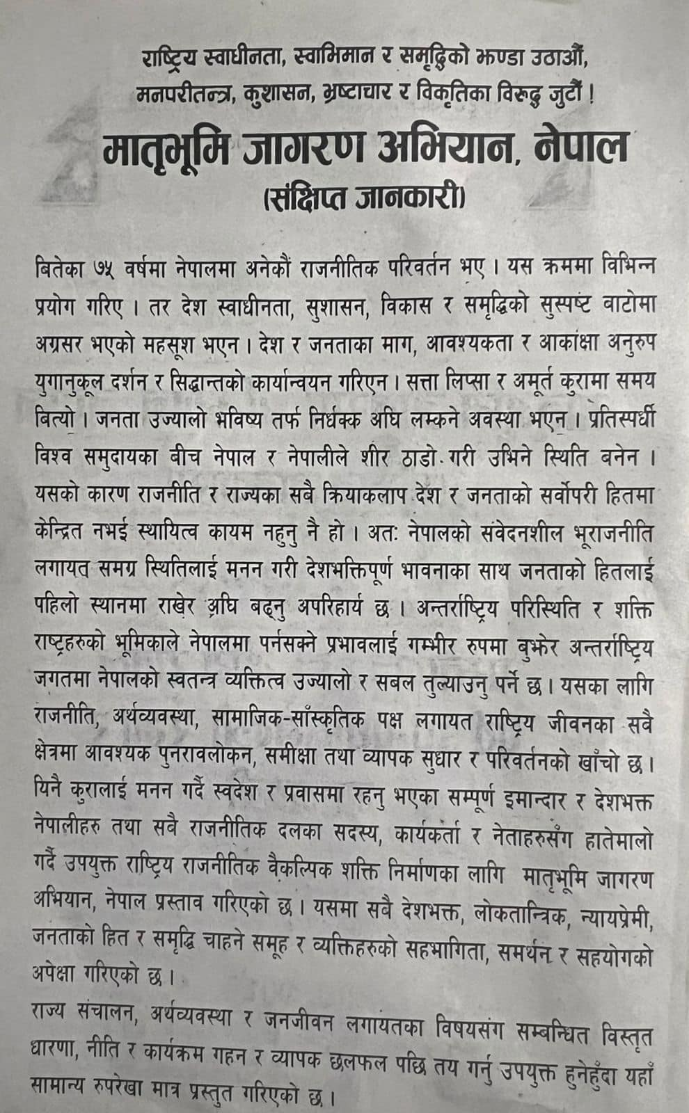 सार्वजनिक अवधारणा पत्र अनुसार उनको पार्टीको नाम ‘मातृभूमि जागरण अभियान, नेपाल’ रहनेछ ।