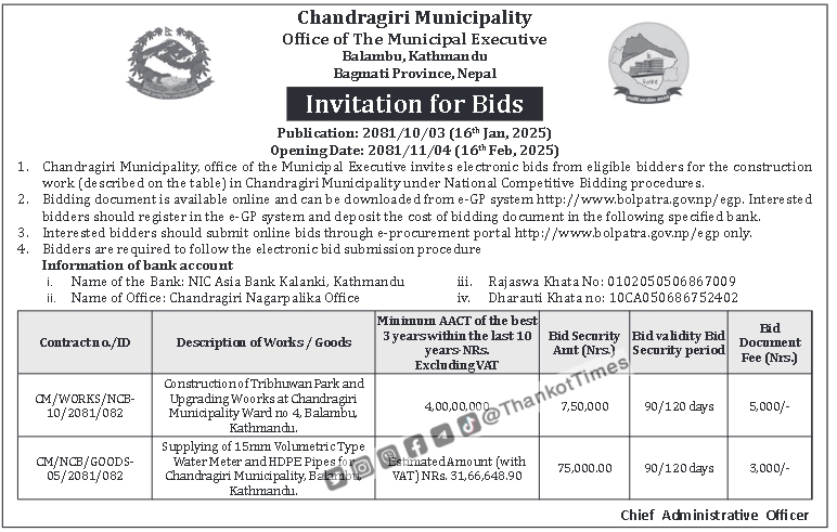 त्रिभुवन पार्कको स्तरोन्नतिका लागि चन्द्रागिरि नगरपालिकाले बोलपत्र आह्वान गरेको छ ।