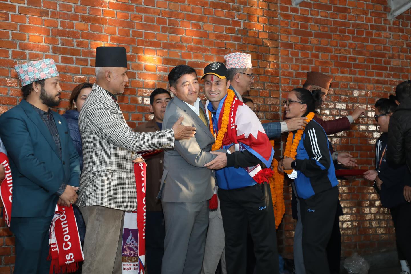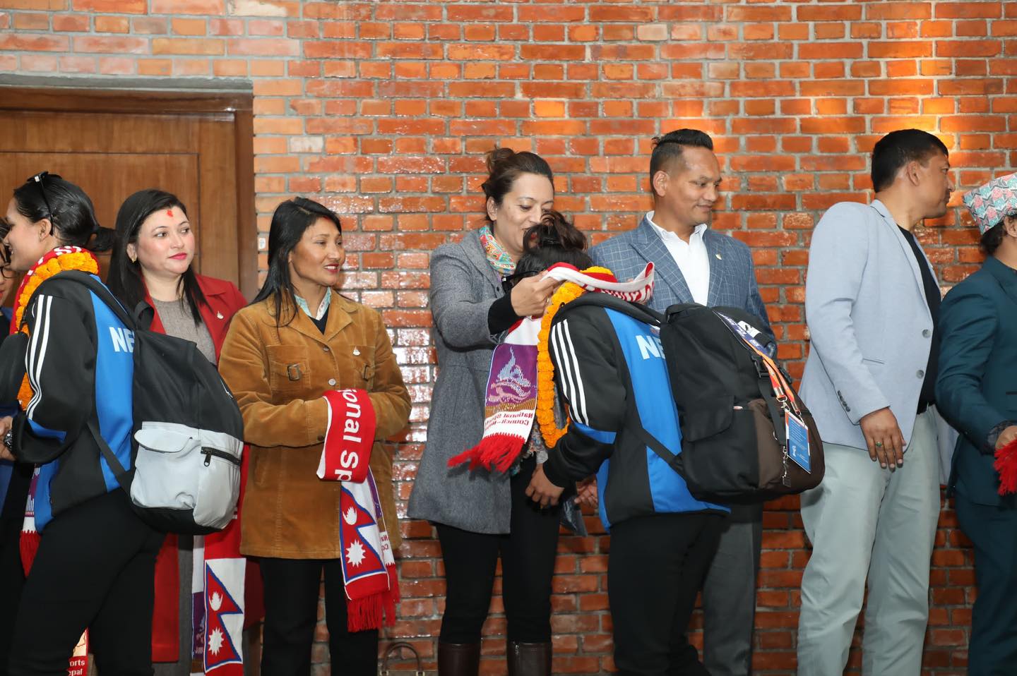 टोलीलाई राष्ट्रिय खेलकुद परिषद् (राखेप)का उपाध्यक्ष ध्रुव आचार्य, सदस्य सचिव टंकलाल घिसिङ, , युवा तथा खेलकुद मन्त्रालयका सचिव डा. हरिप्रसाद लम्साल, खो खो संघका अध्यक्ष प्रदिप महर्जन लगायतले त्रिभुवन विमानस्थलमा स्वागत गरे ।