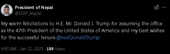 राष्ट्रपति रामचन्द्र पौडेलले अमेरिकाको राष्ट्रपतिको कार्यभार ग्रहण गरेकोमा समकक्षी डोनाल्ड ट्रम्पलाई बधाई दिएका छन् ।