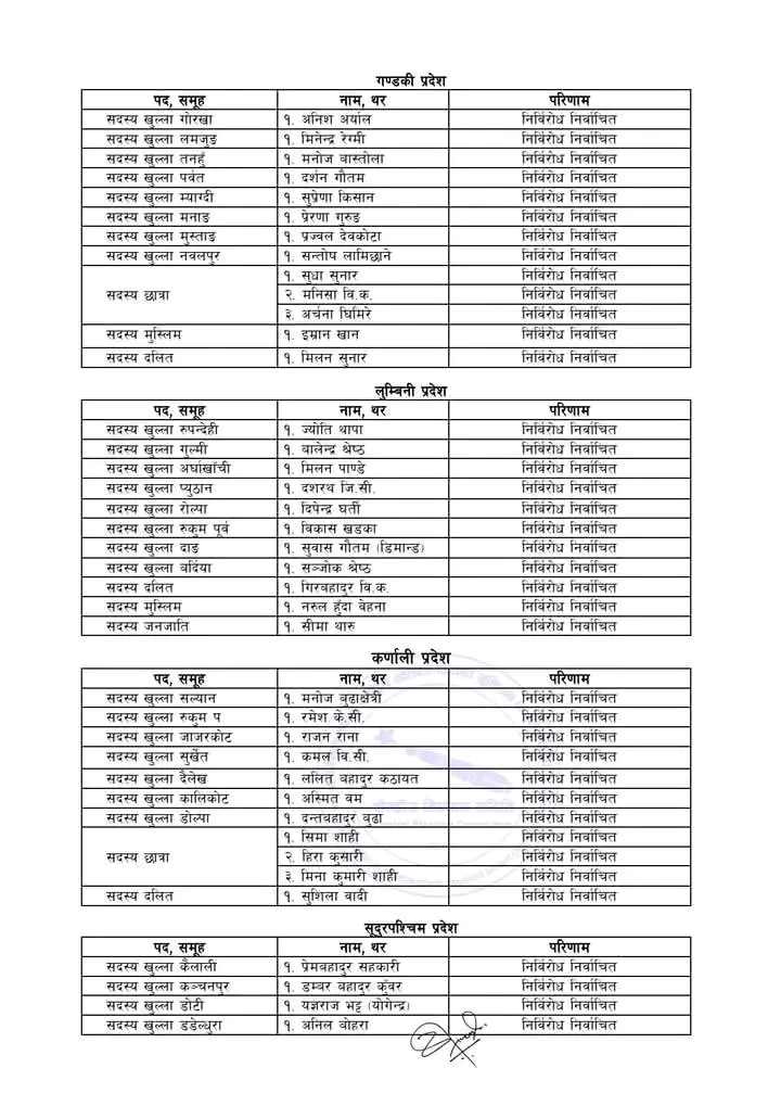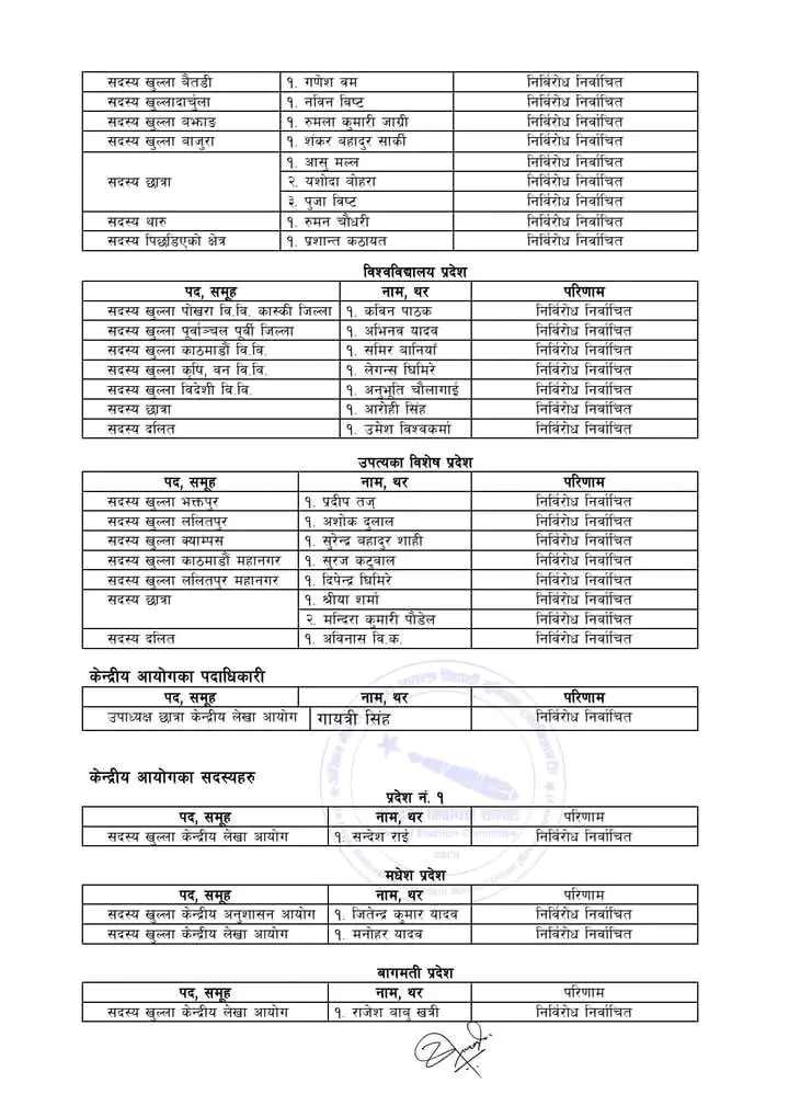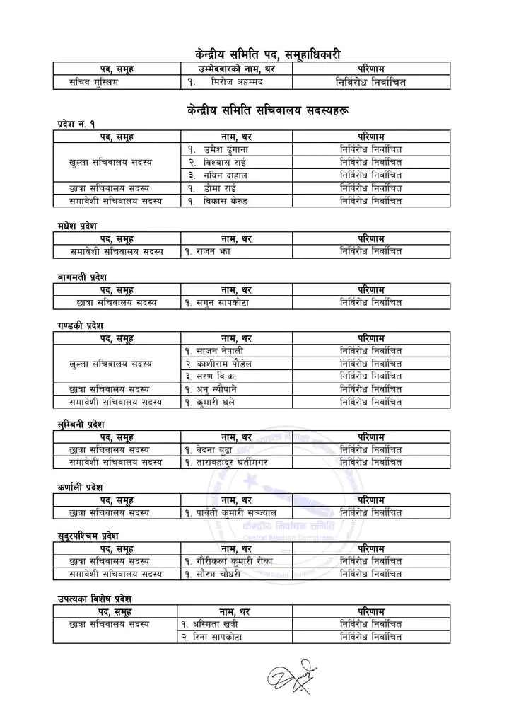 सम्मेलनमा विभिन्न पदका उम्मेदवार निर्विरोध भएको निर्वाचन समितिले जनाएको छ ।  केन्द्रीय पदाधिकारी, सचिवालय सदस्य, केन्द्रीय सदस्य र आयोगका पदाधिकारी तथा सदस्यमा केही उम्मेदवार निर्विरोध भएका हुन् ।