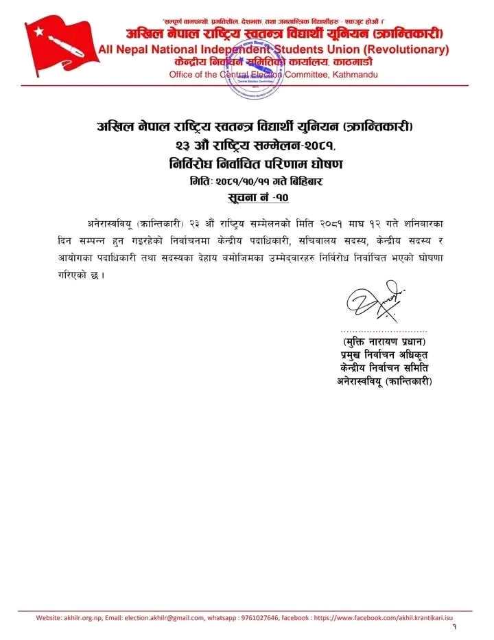 नेकपा माओवादी केन्द्र निकट अनेरास्ववियु (क्रान्तिकारी)को भावी नेतृत्वका लागि आज निर्वाचन हुँदैछ ।