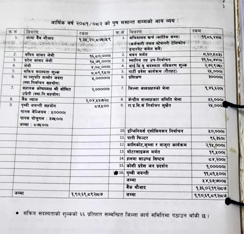 जसअनुसार पार्टीको खातामा १ करोड ३६ लाख २ हजार १९२ रुपैयाँ मौज्दात छ ।