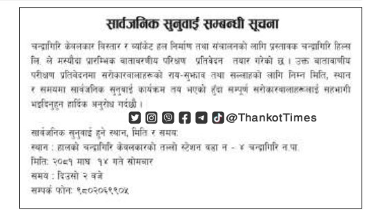 गत माघ ८ गते मंगलबार हिमालय टाइम्समा प्रकाशित सो कार्यक्रम बारेको सूचनामा उल्लेख भएअनुसार केबलकार विस्तार तथा ब्यांकेट हल निर्माणका लागि तयार भएको प्रारम्भिक वातावरणीय परीक्षण प्रतिवेदनमाथि छलफल तथा सार्वजनिक सुनुवाईको कार्यक्रम चन्द्रागिरि नगरपालिका वडा नं. ४ थानकोटस्थित चन्द्रागिरि केबलकारको तल्लो स्टेशनको सभा हल हुनेछ ।