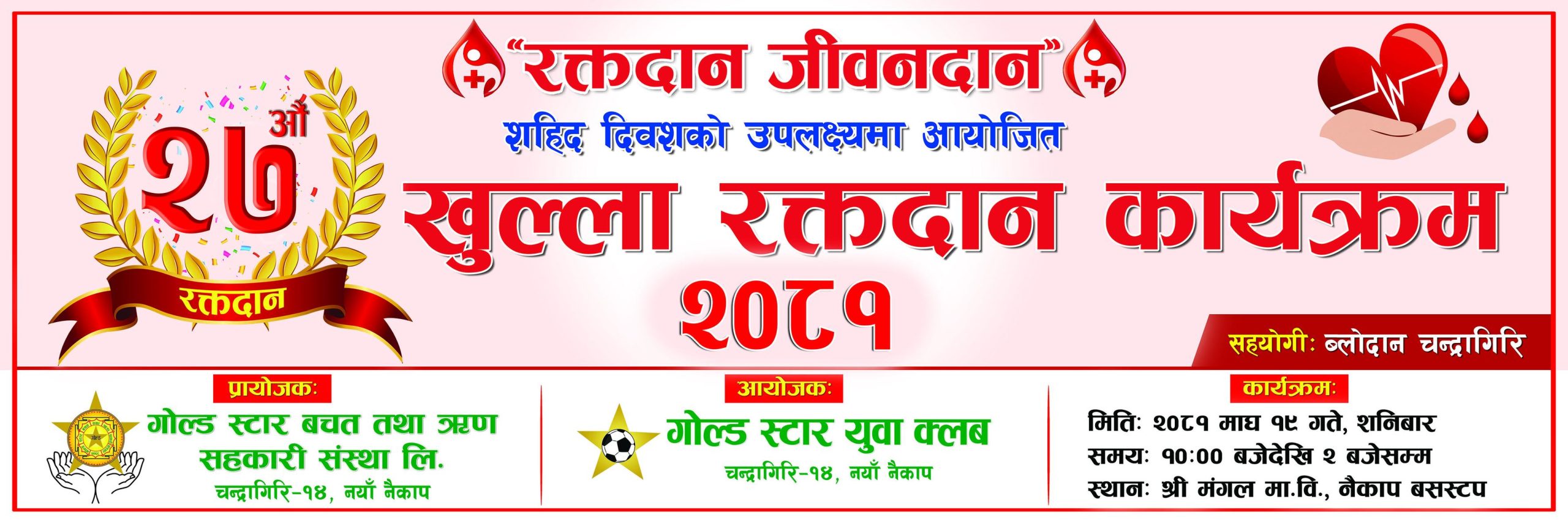 गोल्ड स्टार युवा क्लबले ब्लोदान चन्द्रागिरिसँगको सहकार्यमा सो रक्तदान कार्यक्रम संयोजन गर्न लागेको हो ।