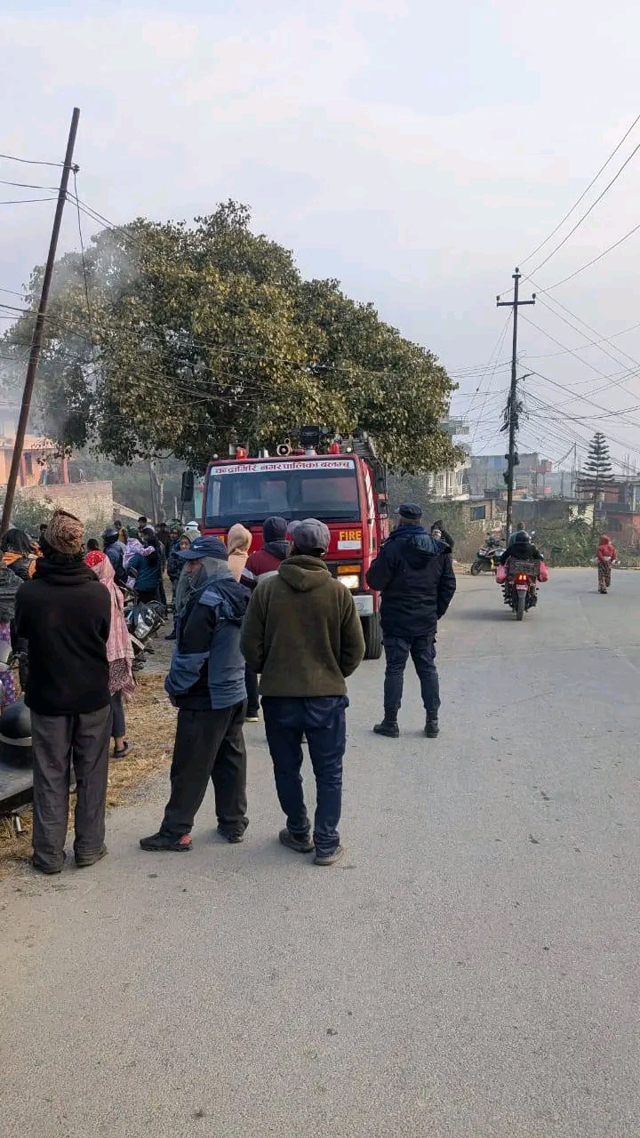 …अनि चन्द्रागिरि नगरकाे दमकल साइरन बजाउँदै मातातिर्थतर्फ उकालाे लाग्याे, आगलागीबाट ५ लाख बराबरको धनमाल क्षति