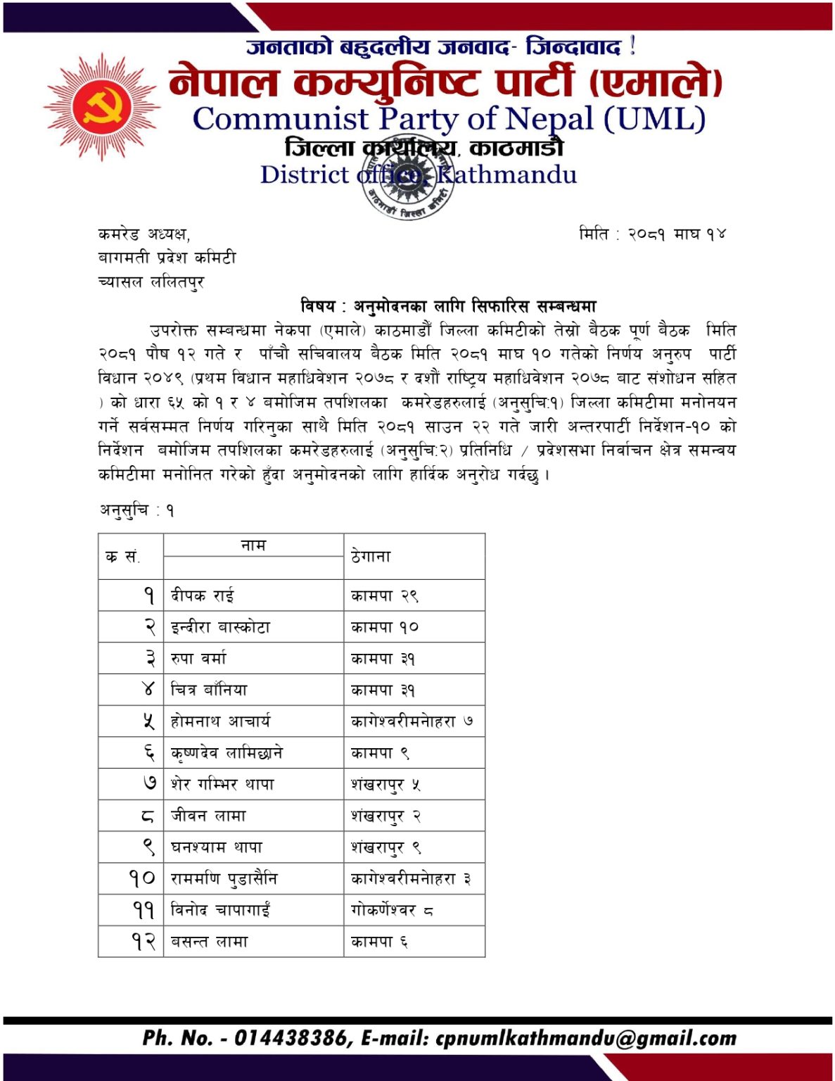 साे पार्टीका काठमाडौं जिल्ला अध्यक्ष दीपक निरौलाका अनुसार एमाले जिल्ला कमिटीको तेस्राे पूर्ण बैठक र माघ १० गतेको पाँचाैं सचिवालय बैठकको निर्णय अनुसार पार्टी विधानको धारा ६५ को उपधारा १ र ४ बमोजिम मनोनित गरिएको हाे ।