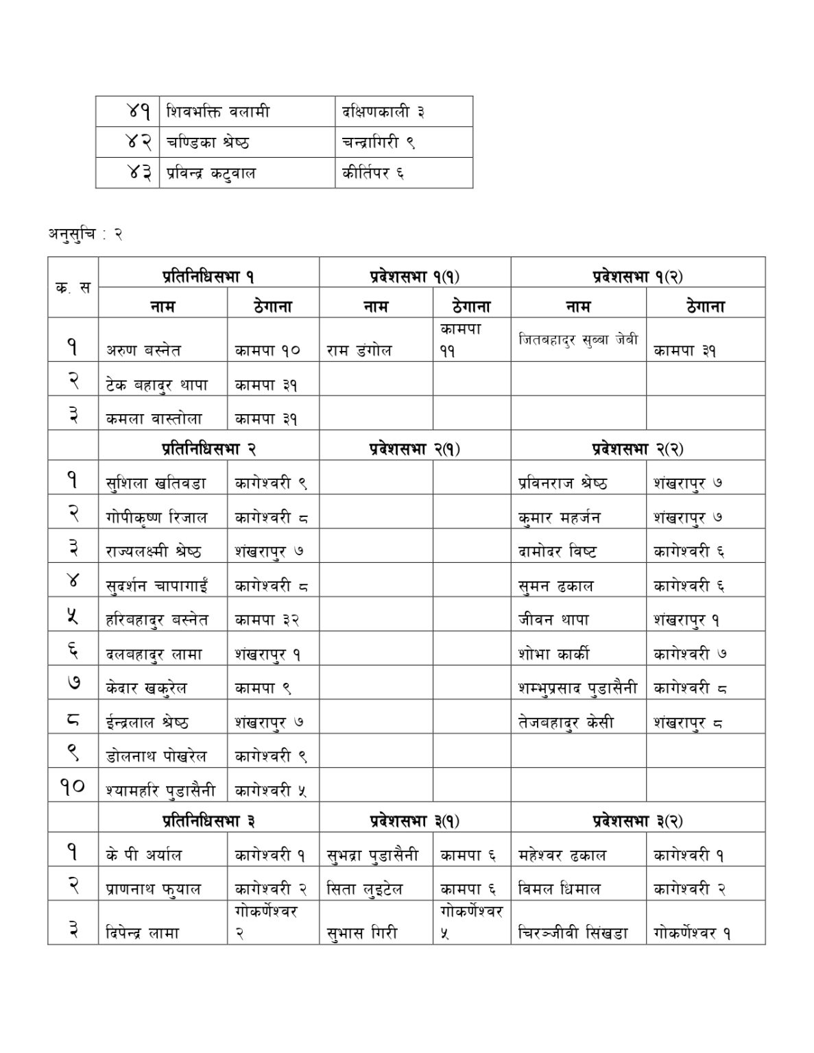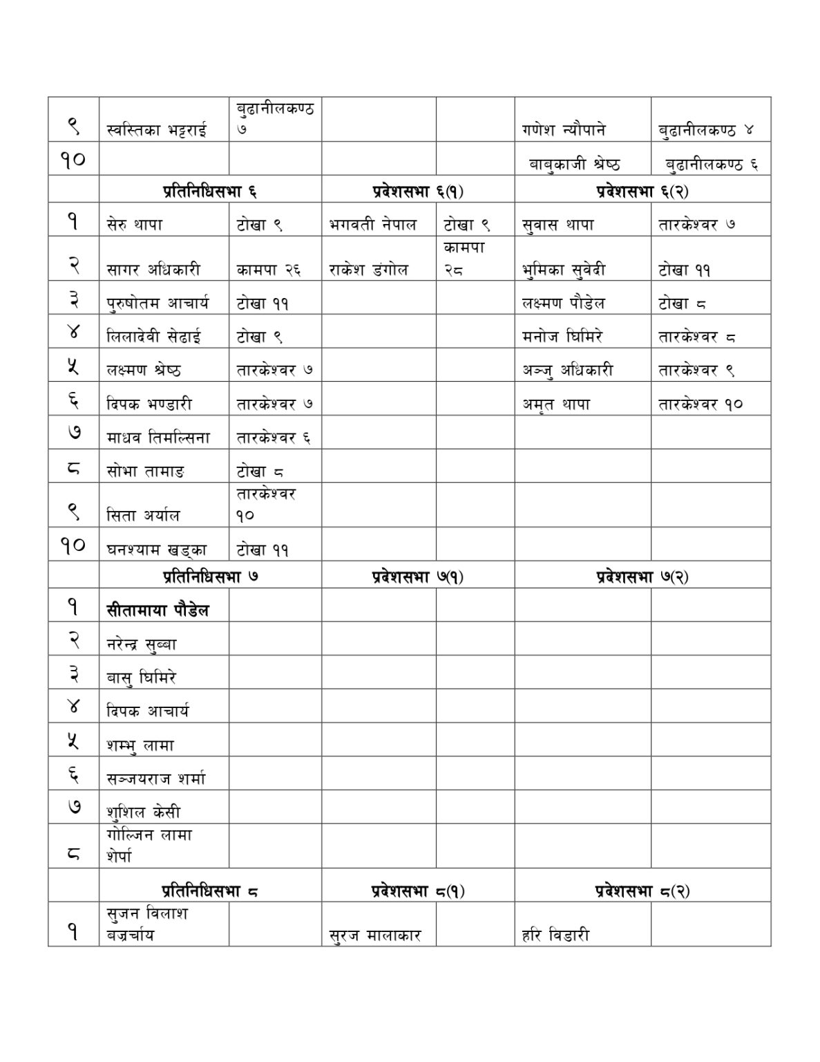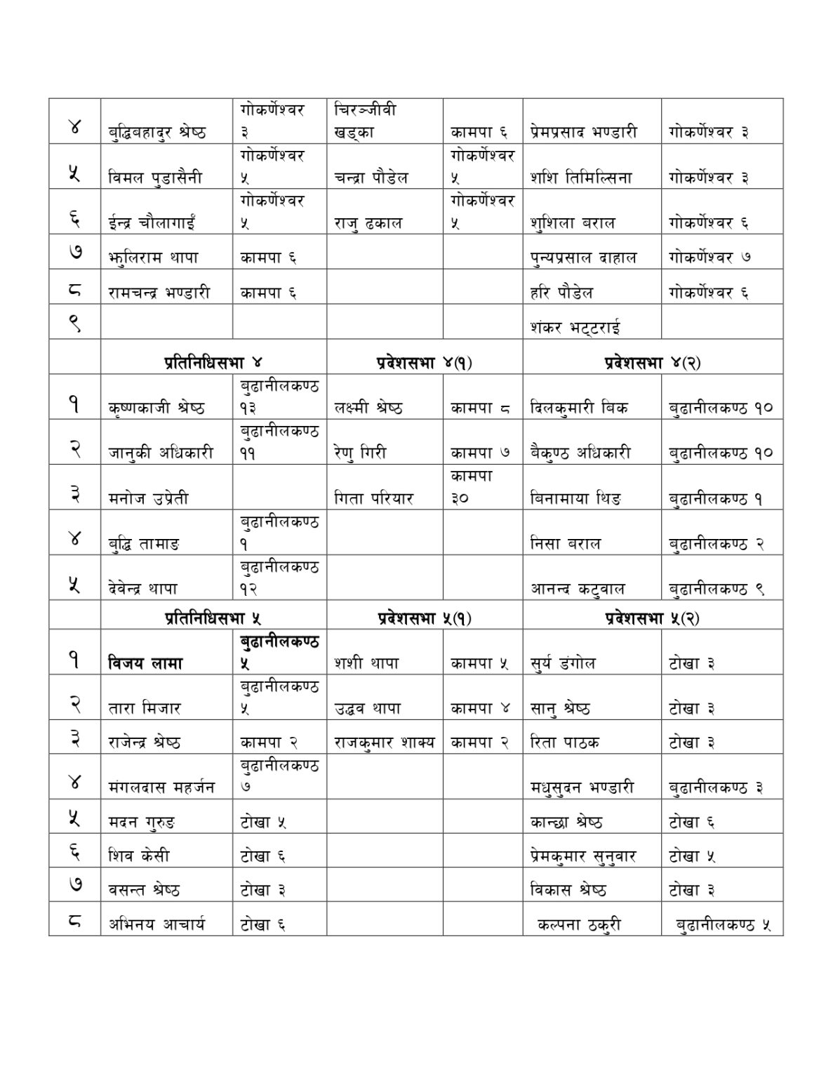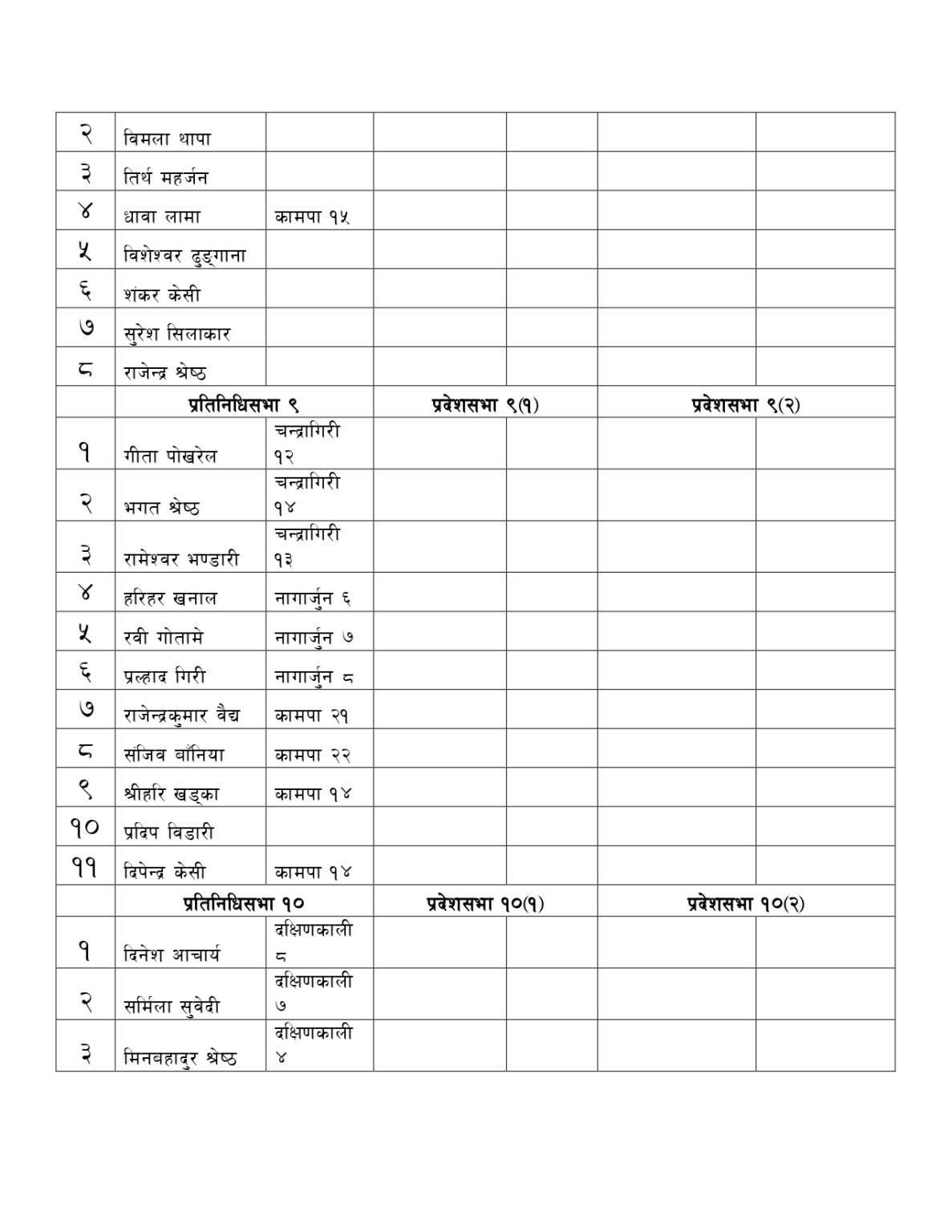 यसैगरी प्रतिनिधि/ प्रदेश सभा निर्वाचन समन्वय कमिटीमा काठमाडौं क्षेत्र नं ९ अन्तर्गत चन्द्रागिरि नगरबाट चन्द्रागिरि-१२ कि गिता पाेखरेल, चन्द्रागिरि १४ का भगत श्रेष्ठ, चन्द्रागिरि १३ का रामेश्वर भण्डारी मनाेनित भएका छन्। यसैगरी काठमाडौं क्षेत्र नं १० बाट चन्द्रागिरि वडा नं ७ का सुरेन्द्र थापा र राम थापा, चन्द्रागिरि २ का उत्तम रेग्मी, चन्द्रागिरि ११ की कृष्णदेवी महर्जन र चन्द्रागिरि ६ का माधव रेग्मी मनाेनित भएका छन् ।