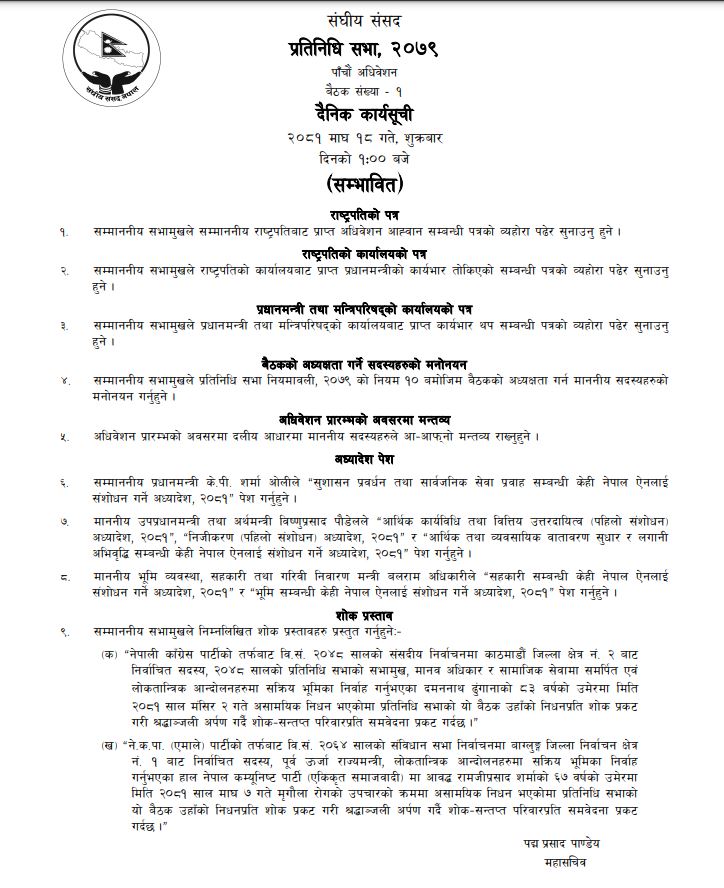 दिउँसो १ बजे दुवै सदन (राष्ट्रिय सभा र प्रतिनिधि सभा)को बैठक काठमाडौंको नयाँ बानेश्वरस्थित अन्तर्राष्ट्रिय सम्मेलन केन्द्रमा बस्नेछ ।