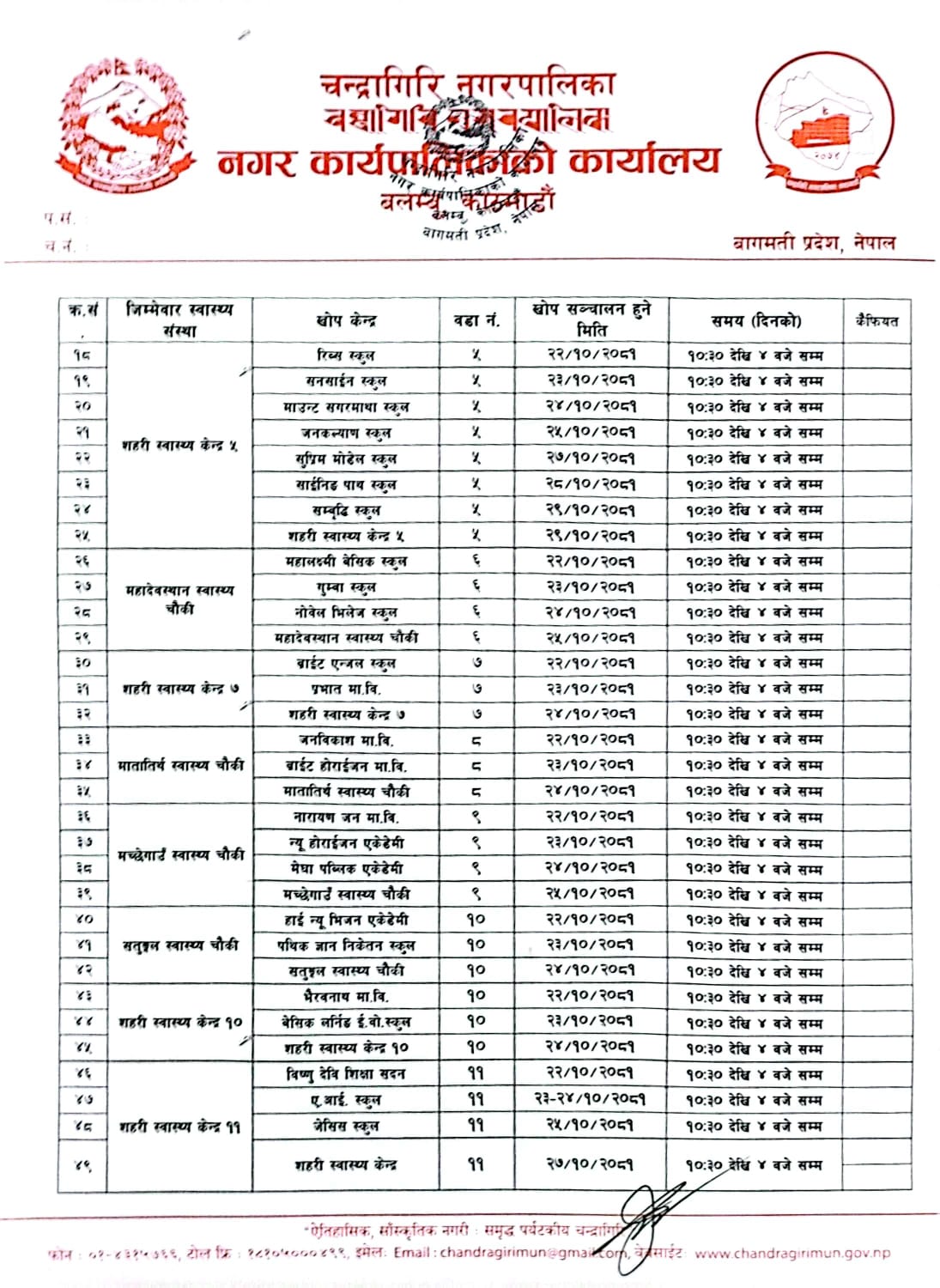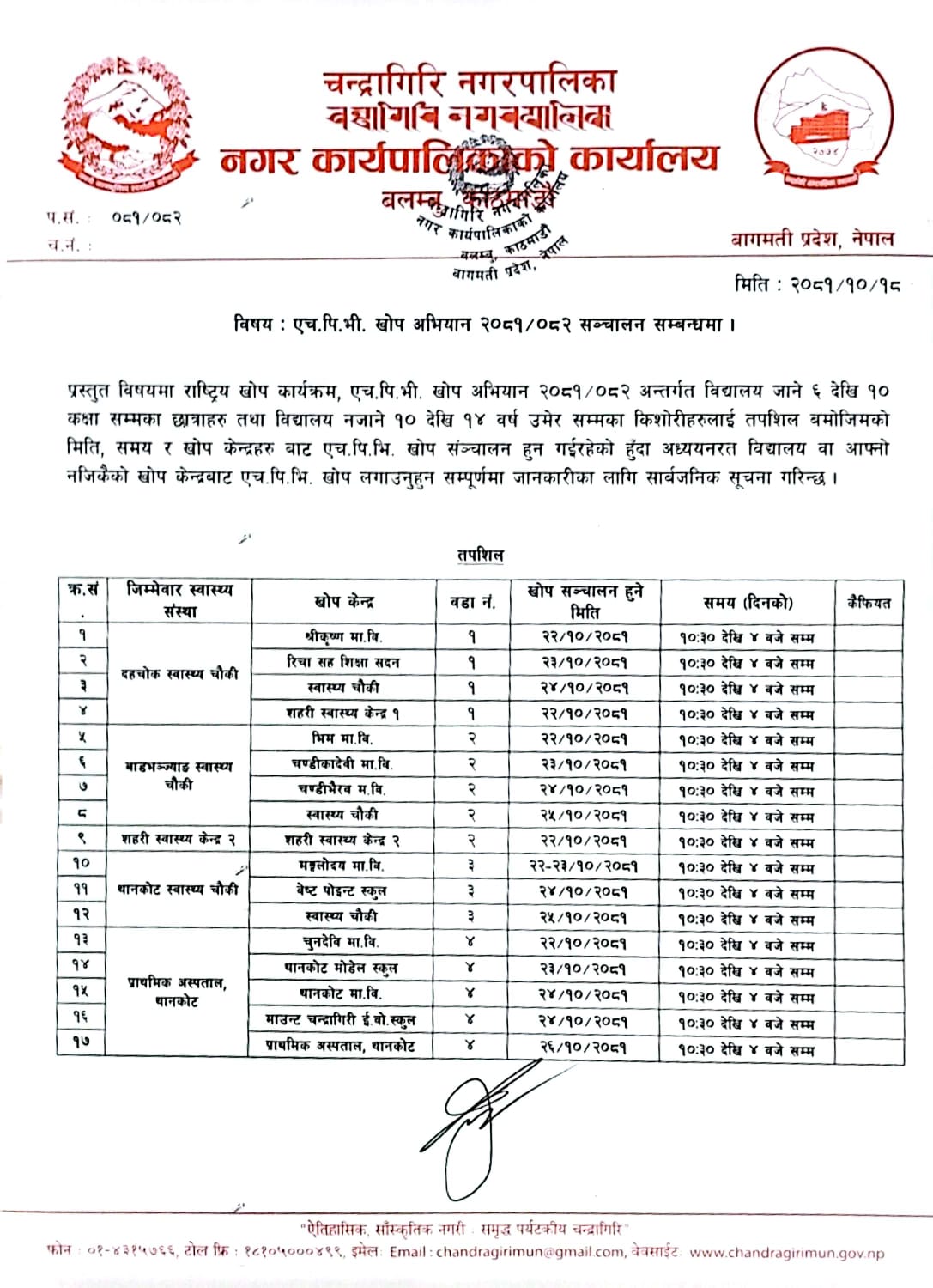 चन्द्रागिरि नगरपालिकामा राष्ट्रिय खोप कार्यक्रम, एच.पी.भी. खोप अभियान माघ २२ गते मंगलबारबाट सुरु हुँदैछ ।