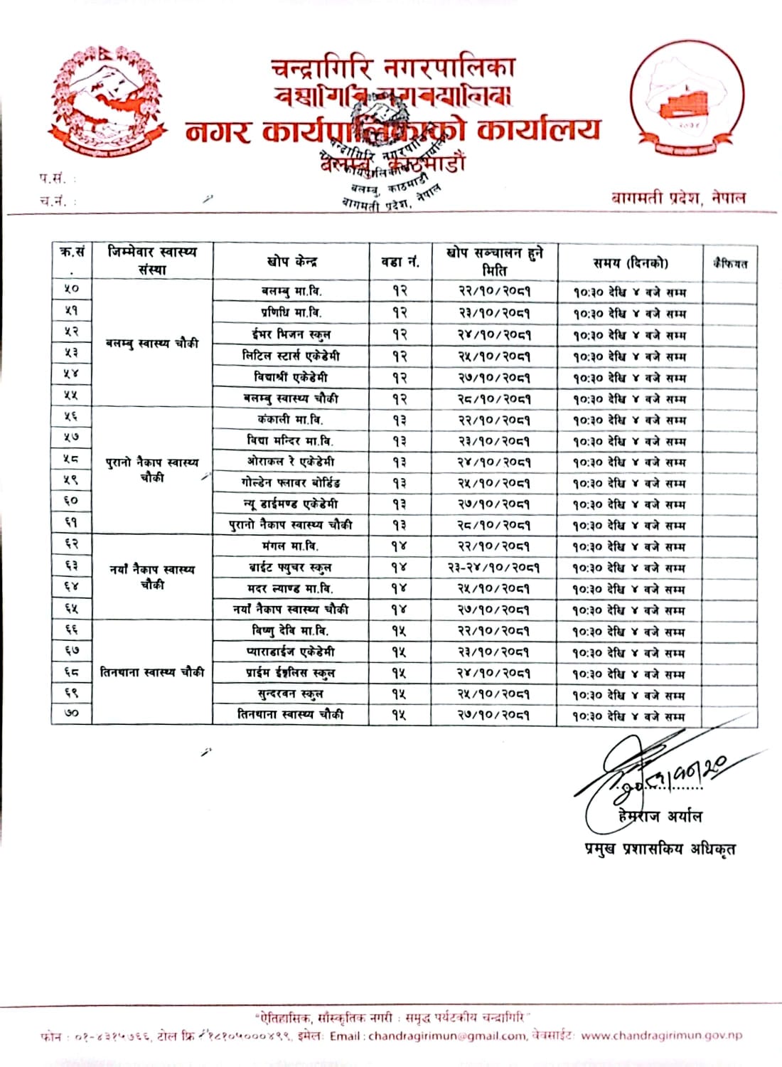 एच.पी.भी. खोप अभियान सञ्चालनका लागि चन्द्रागिरि नगरले ७० वटा खोप केन्द्र तय गरेको छ ।
