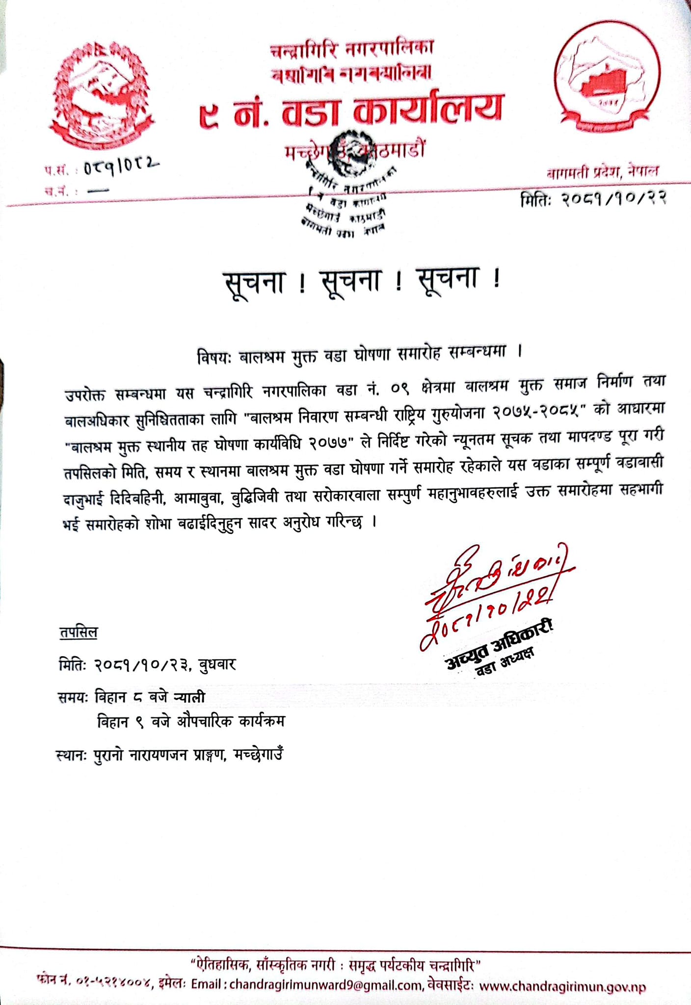चन्द्रागिरि नगरपालिका- ९ मच्छेगाउँ आज बालश्रममुक्त वडा घोषणा हुने क्रममा रहेको छ ।