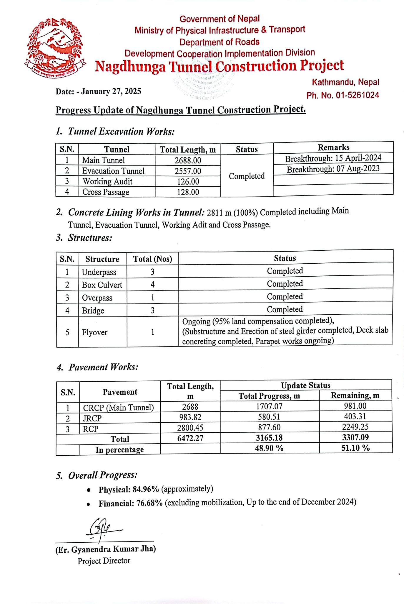 राष्ट्रिय गाैरवको परियोजना नागढुङ्गा सुरुङमार्ग आयोजनाको भौतिक प्रगति ८५ प्रतिशत पुगेको छ ।