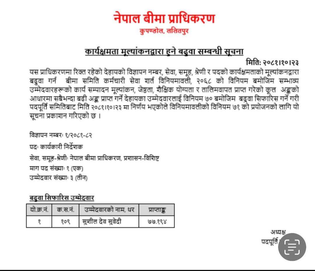 बीमा प्राधिकरणमा गत जेठदेखि रिक्त रहेको कार्यकारी निर्देशकमा लोकसेवाको प्रक्रिया पुरा गरी नयाँ कार्यकारी निर्देशक नियुक्त गर्न पदपूर्ति समितिले बुधबार सिफारिस गरेको हो ।
