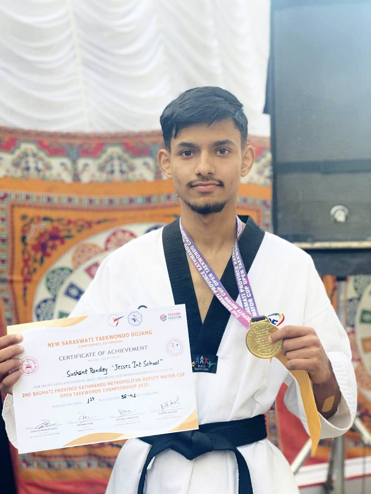 सतुङ्गलस्थित जेसिस इन्टरनेसनल बोर्डिङ सेकेण्डरी स्कुलमा कक्षा ११ मा अध्ययनरत छात्र सुसन पाण्डेले दोश्रो बागमती प्रदेश काठमाडौं महानगरपालिका उपमेयर कप खुल्ला तेक्वान्दो च्याम्पियनसिप २०२५ मा स्वर्ण पदक जितेका छन् ।